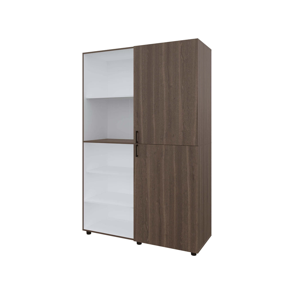 The grey walnut and white wardrobe pairs warm walnut tones with a clean white finish, creating a striking contrast that elevates bedroom style. Featuring concealed compartments behind two doors and open sections for quick access or display, it delivers both functionality and modern elegance while maximizing storage efficiency.