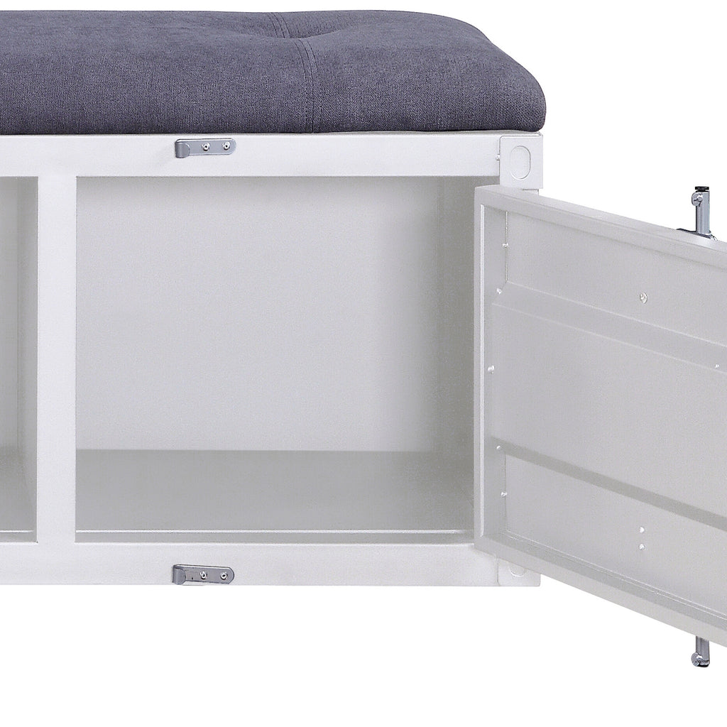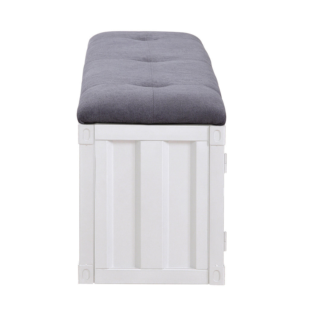 This modern industrial storage bench combines contemporary style with rugged elements, making it a versatile piece for your entryway or living room. The upholstered grey seat offers comfort and style, while the cabinet with two metal doors provides ample storage space, an open shelf adds extra storage or display options, and a full-length container lock ensures the security of your items.