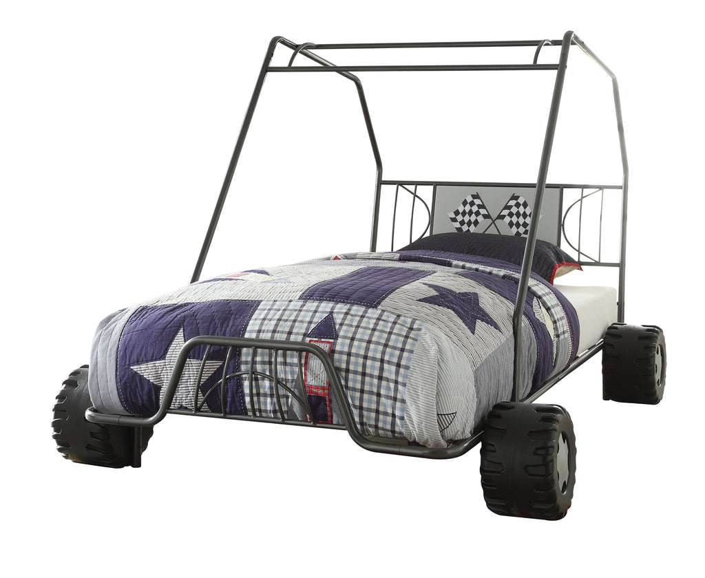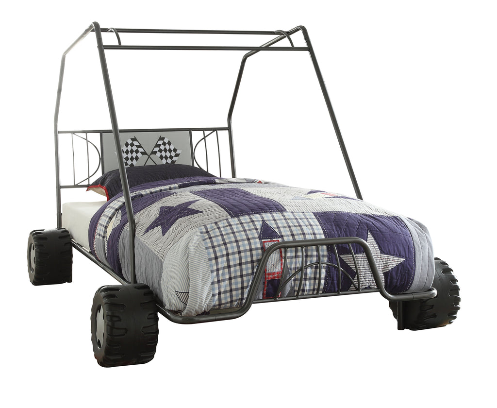 The Twin Metal Bed boasts a fun go-kart design, making it a playful addition to any child's bedroom. Featuring an 8-slat system that eliminates the need for a box spring, it has an 18-inch high footboard and provides an 8-inch clearance between the floor and rail for easy cleaning and storage.