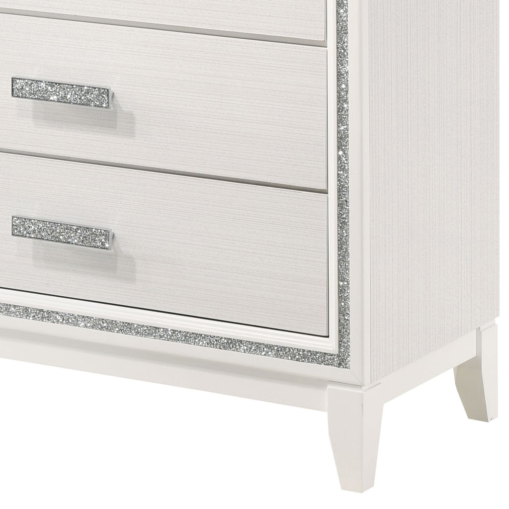 - The shimmering silver trim accent beautifully frames the drawers, infusing the chest with a touch of modern glamour and sophistication, making it a luxurious addition to any bedroom or living space.
