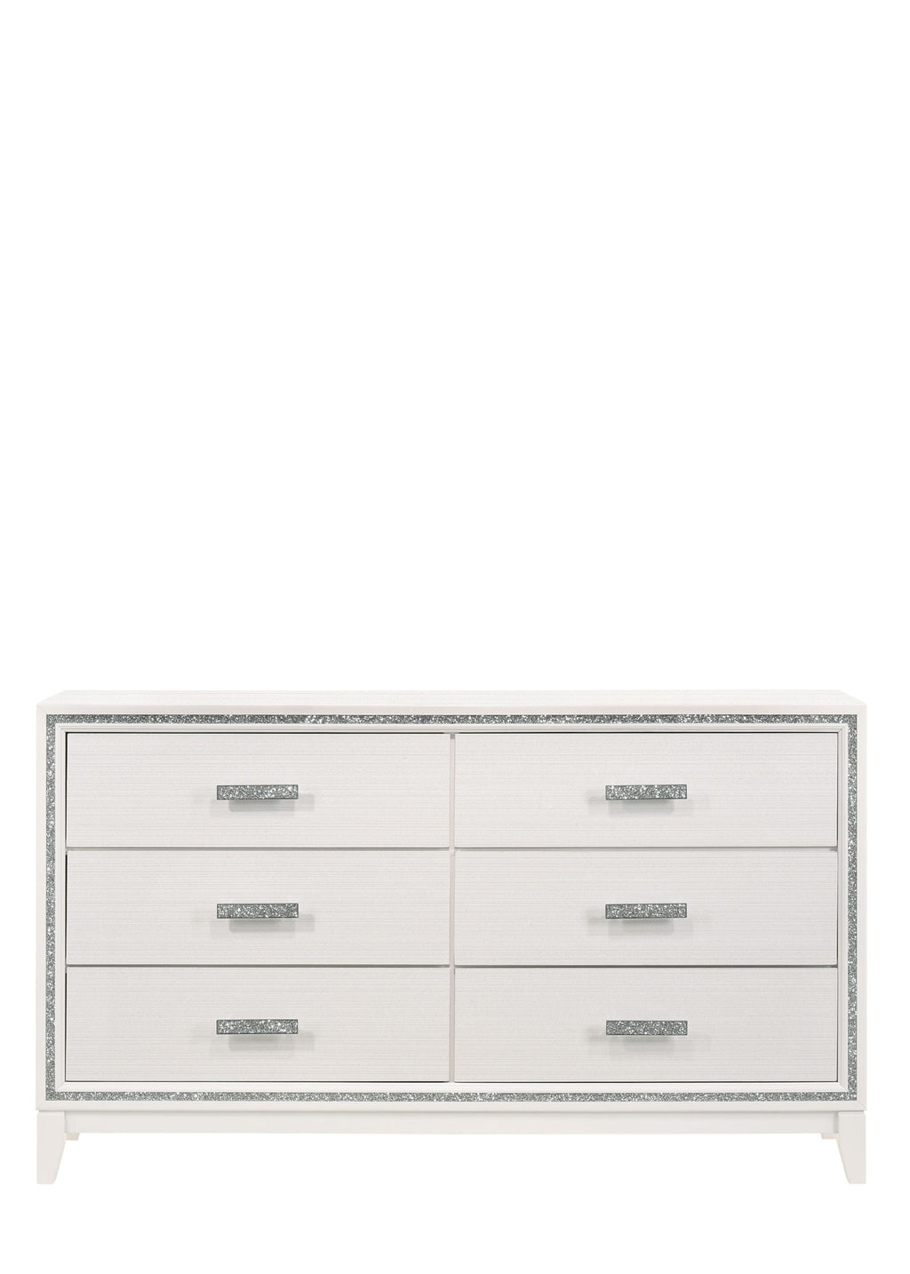 - The shimmering silver trim accent beautifully frames the drawers, adding a touch of glamour and sophistication to the piece, making this dresser not just a storage solution, but a statement of refined style in any bedroom.
