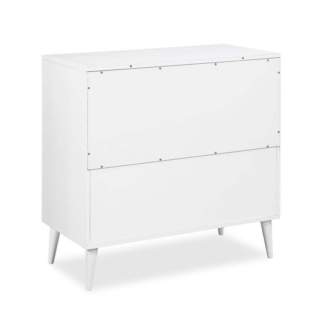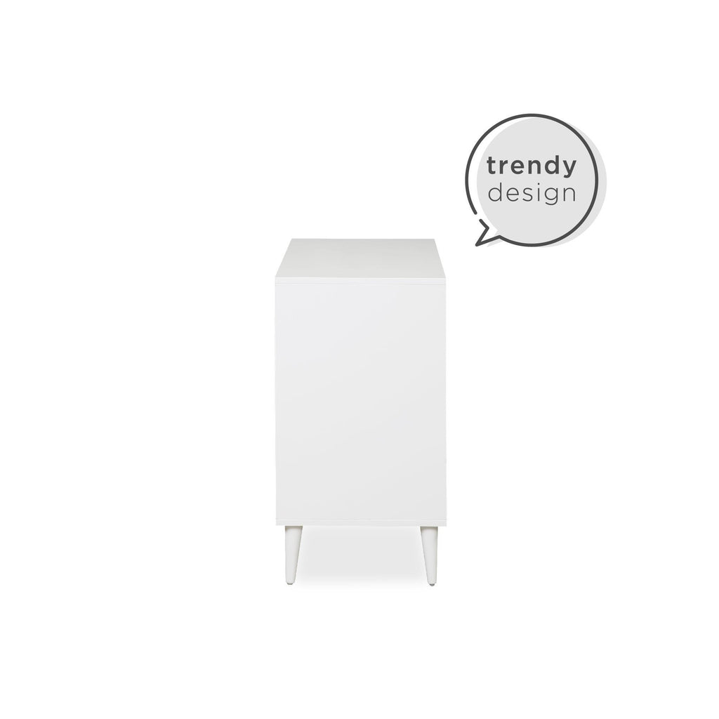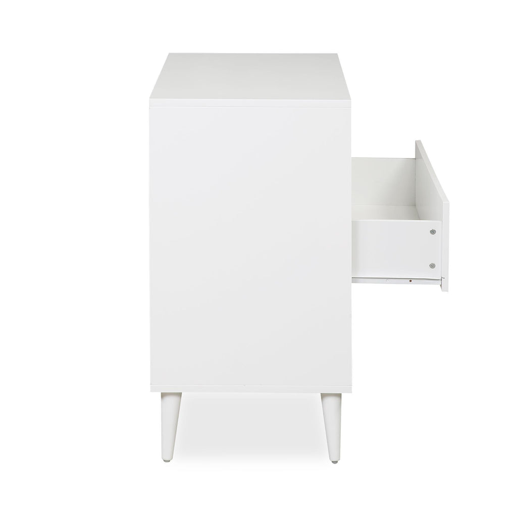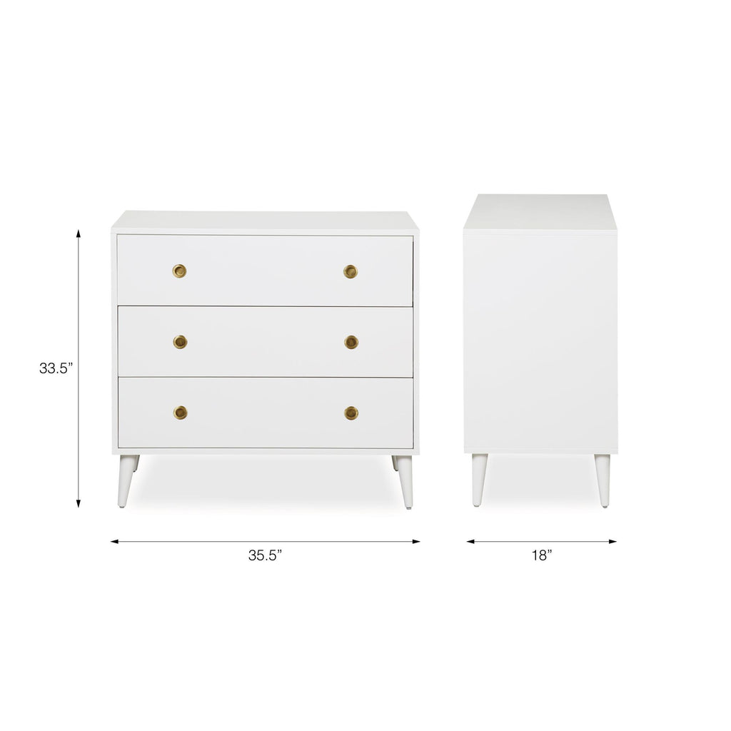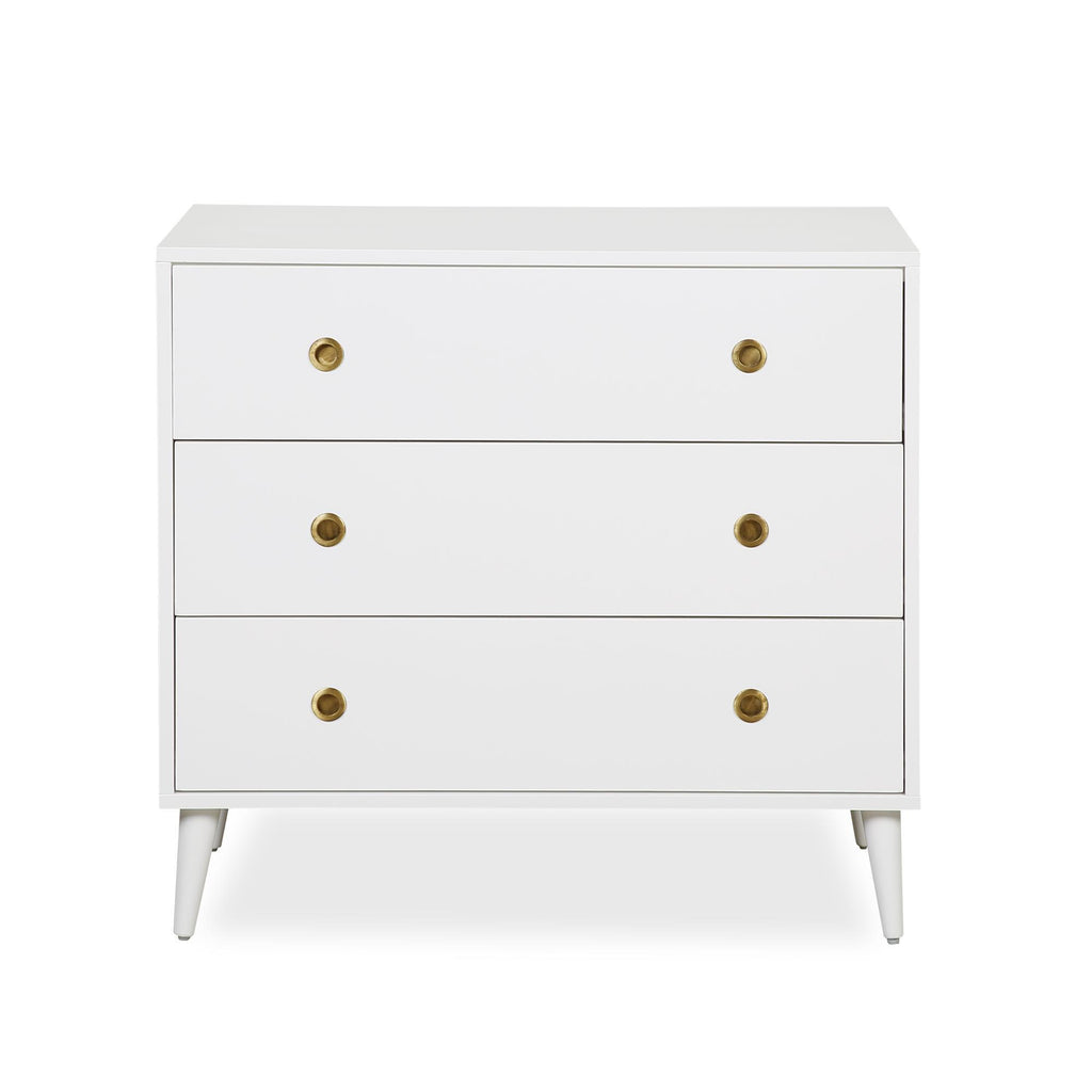 The Harper 3-Drawer Dresser is the piece you need to finish your baby nursery or child bedroom. Inspired in the Mid-Century Modern style, this dresser features slanted solid wood legs and circular brass pulls. The Harper Dresser comes with 3 spacious drawers to help you keep your little one's room tidy and organized. Elegantly crafted with solid pine wood, this dresser withstand the test of time with its sturdy and durable construction. This dresser includes a safety wall strap to ensure top safety for your little one when installed.