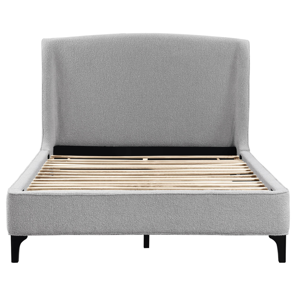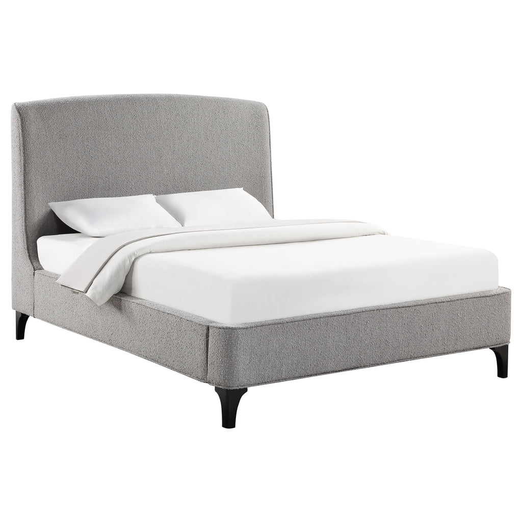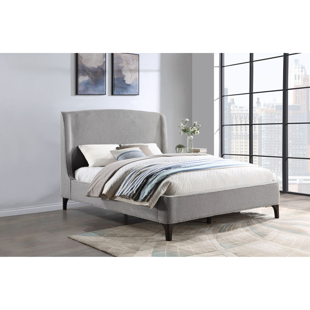 Sleek silhouetting and a compact aesthetic deliver easy style to a modern space as this upholstered bed creates versatility and an easy feel. Dress up a classic bedroom with this bed featuring a fully upholstered curved headboard and a footboard, both covered in gray fabric, and splayed bracket feet add a bit of retro influence.