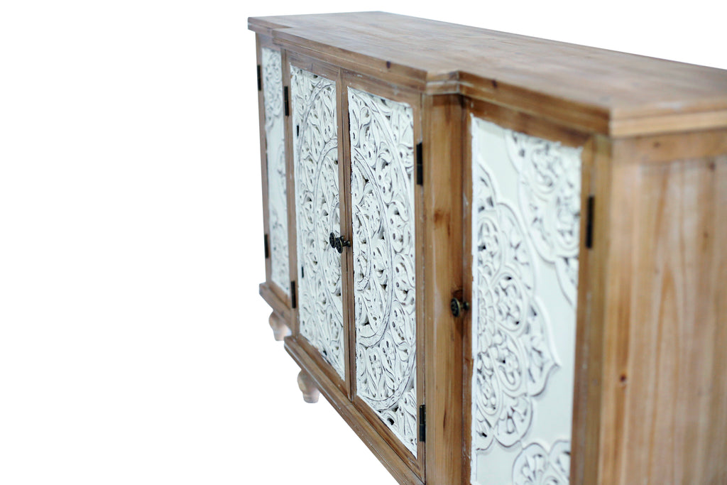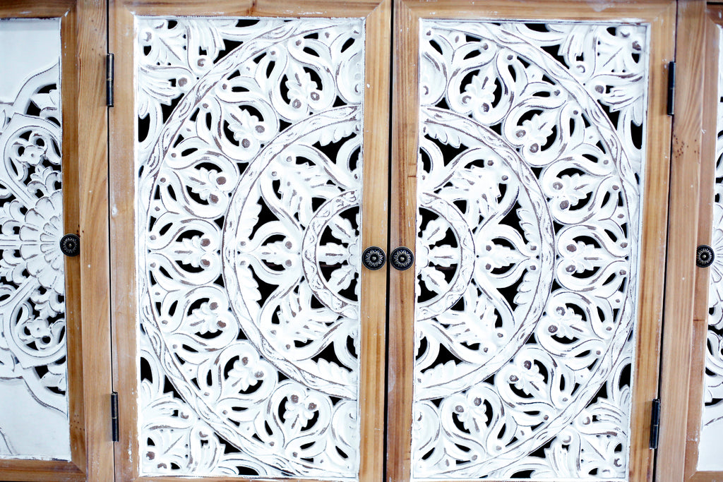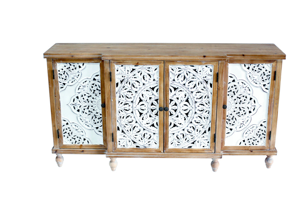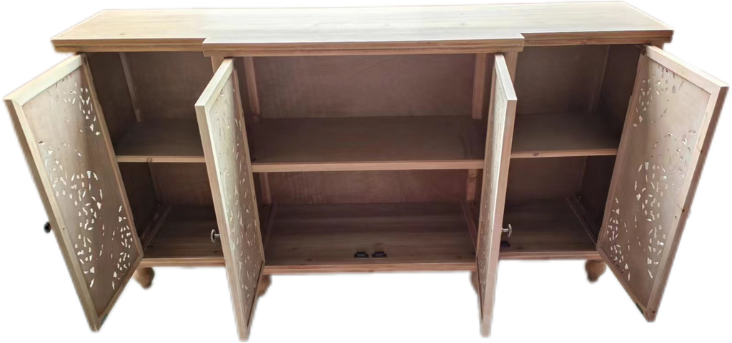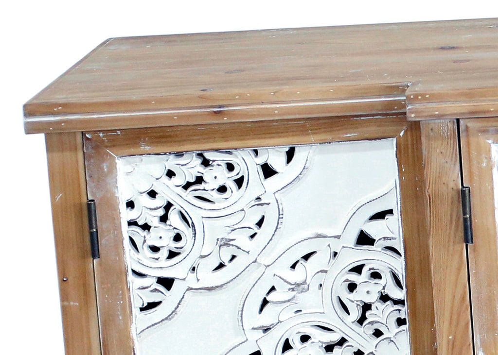 - 4 Hollow-carved Door Cabinet - This vintage chic cabinet features with 4 carved grille door for eye-catching and distinctive character; goes with any shabby chic or vintage style; An antique style, functional design and elegant attention to detail make this cabinet a fine addition to many style home decors