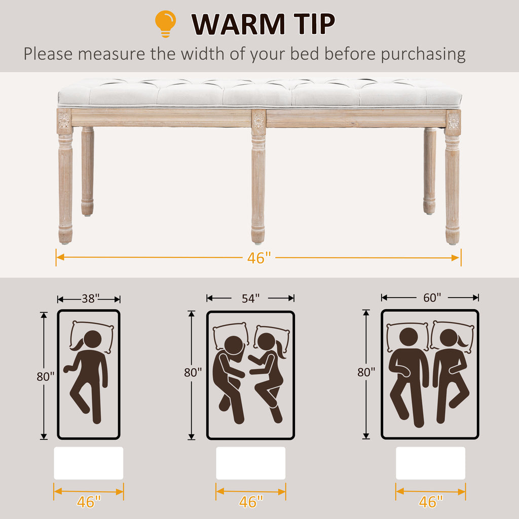 - French Vintage Style Furniture: Our window bench features white brushed wood, delicate carvings, and a button-tufted design to complement your existing interior design choices.