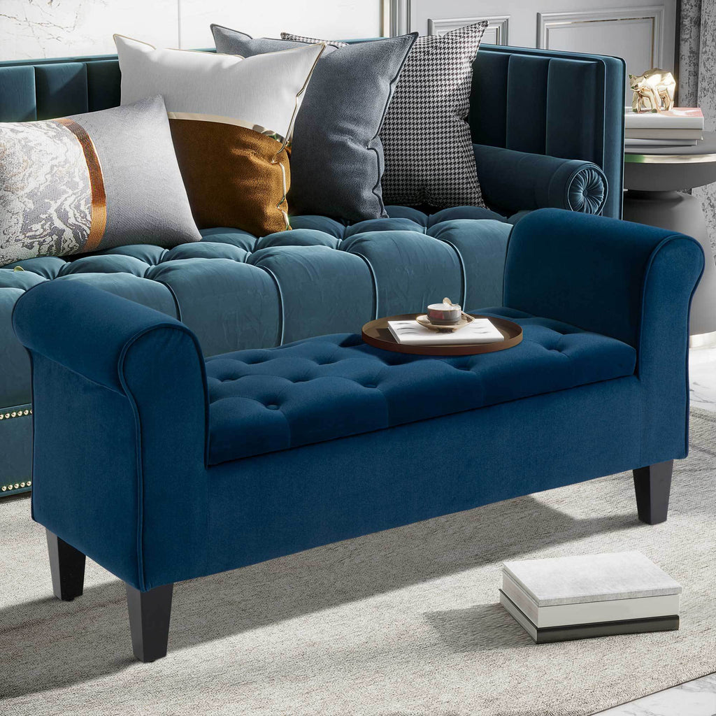 - Elegant Design: This classic and simple look of this storage ottoman blends well in various stylish home setups. The button-tufted design and rolled arms add a touch of old-time glamour to your house.