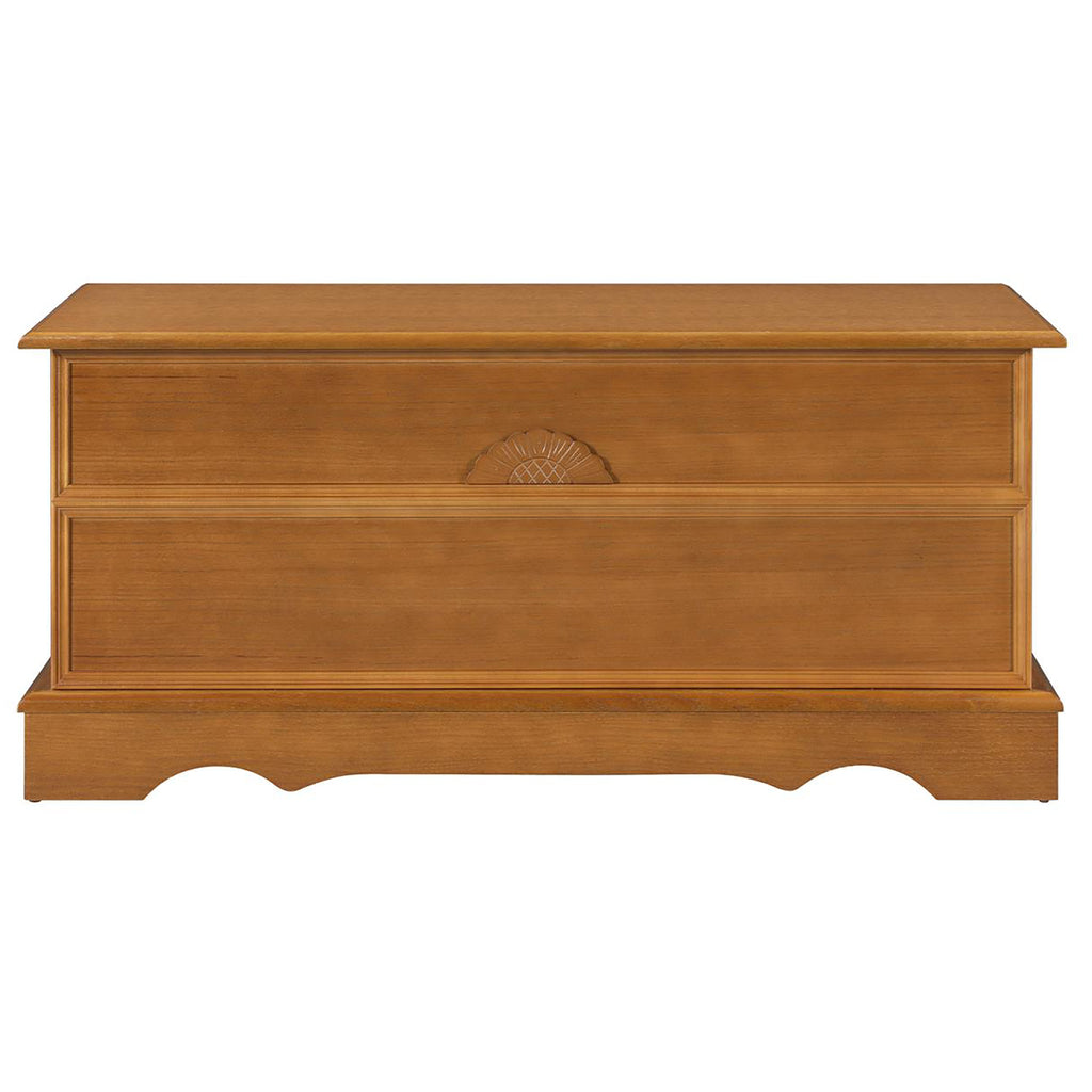Preserve your cherished wool blankets and coats in style with the Lonergan Cedar Chest. This traditional furniture piece boasts a spacious interior and is available in two warm color options. The cedar wood construction ensures lasting freshness, while the scalloped base molding and center floral motif add a touch of elegance to any room