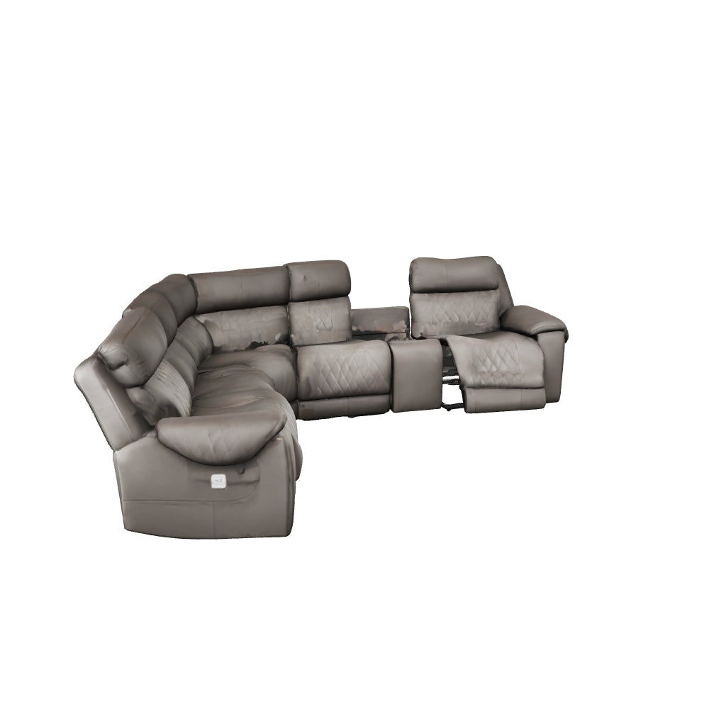 Stylish in design and function, this power reclining sectional with console creates a comfortable place to gather with family and friends. The sectional, upholstered in heavyweight faux leather with quilting and jumbo stitching, invites you to sink into plush opulence at an affordable price. The zero-wall power reclining mechanism features infinite positions for comfort. Conveniently plug in your devices to the USB charging station. Appealing to those with an eye for sumptuous design and high-tech features, this gunmetal gray sectional will always be a win.