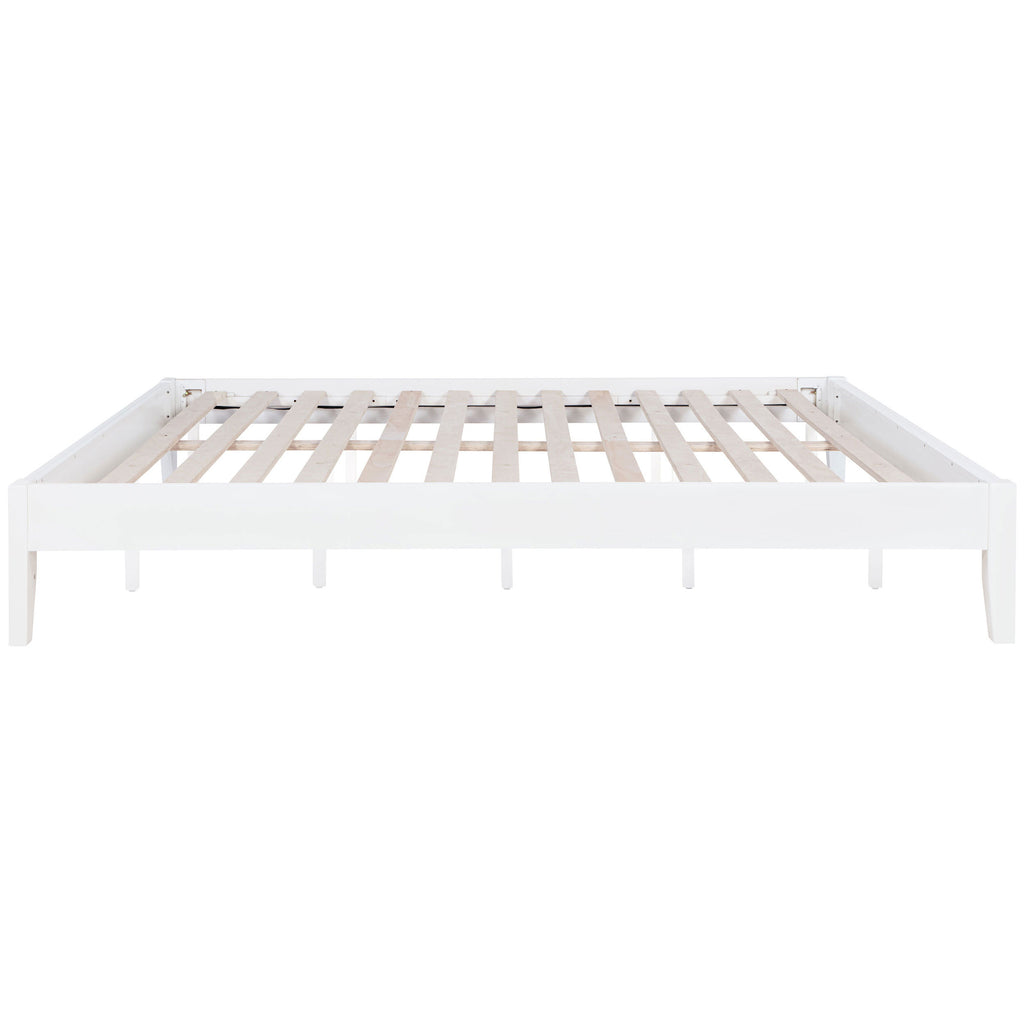 - Universal platform bed features a crisp and modern white finish, seamlessly blending with various bedroom decor styles