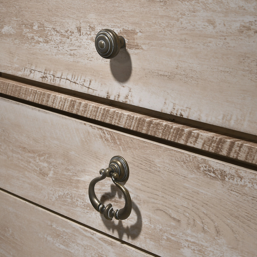The industrial chic style of the Imerland Contemporary White Wash Finish Bedroom Set remakes your bedroom with contemporary cool. Designer details include antique bronze metal pulls in the front of the drawers, and the wood patch pattern on the top of the cases. Solid hardwoods with a white-wash rustic finish provide long-lasting quality construction. Luxurious touches of bun feet, bronze finished metal accents, wood framed mirror.