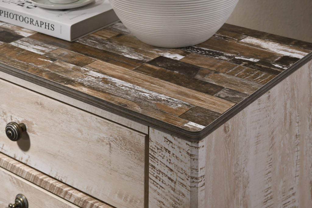 The industrial chic style of the Imerland Contemporary White Wash Finish Bedroom Set remakes your bedroom with contemporary cool. Designer details include antique bronze metal pulls in the front of the drawers, and the wood patch pattern on the top of the cases. Solid hardwoods with a white-wash rustic finish provide long-lasting quality construction. Luxurious touches of bun feet, bronze finished metal accents, wood framed mirror.