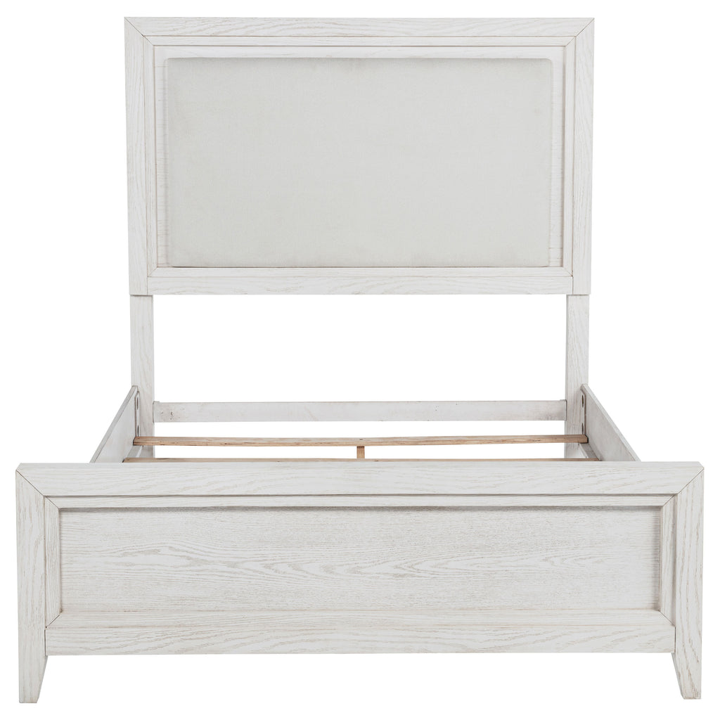 - Modern upholstered bed showcases a wood frame in distressed white finish, accentuating natural grain details for rustic charm