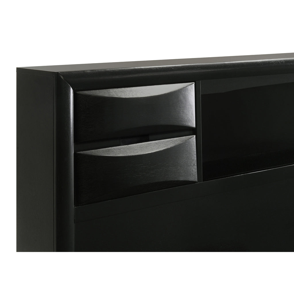 - Bookcase headboard offers four drawers and a center shelf, combining practical storage with stylish display space