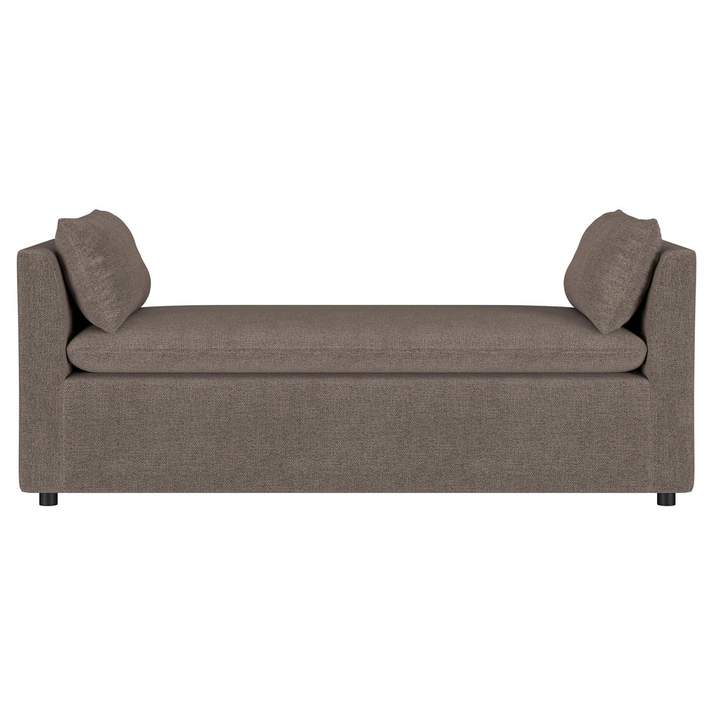 Soft brown upholstery enhanced the timeless character of a modern accent bench with a backless silhouette and rounded arms. A pair of pillows and a plush cushion create exceptional comfort, while a contemporary profile makes this a chic addition in a bedroom, den, or living area.