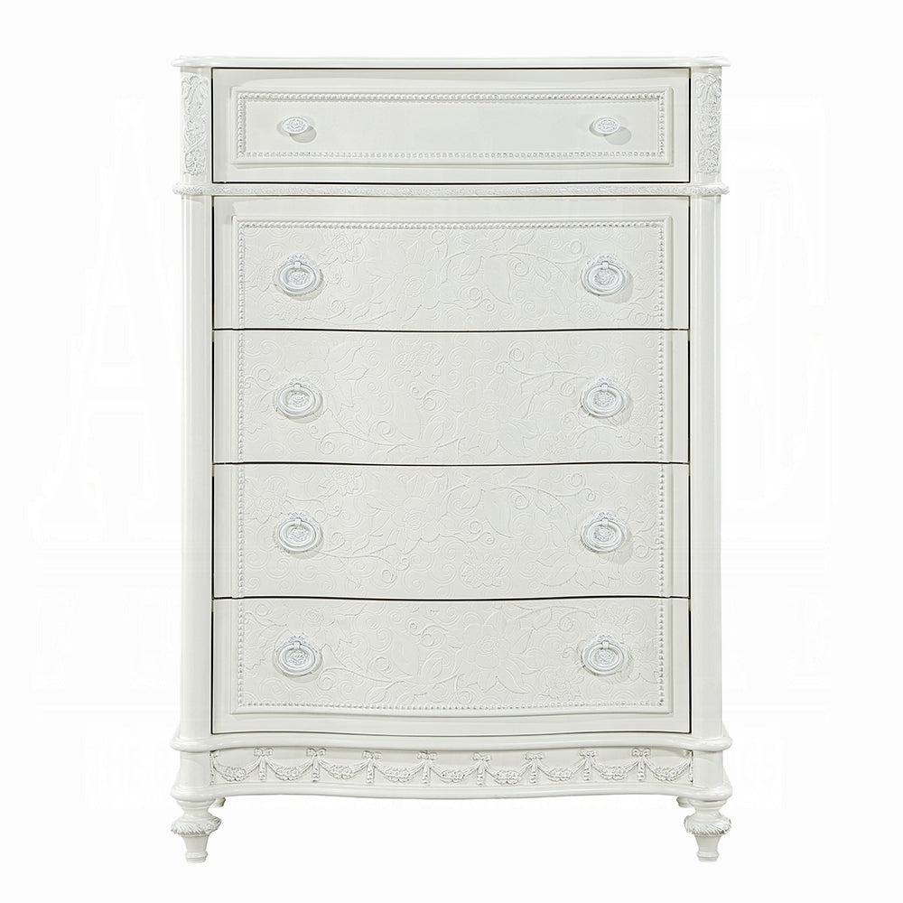 Elevate your bedroom décor with this spacious chest, featuring five drawers adorned with a mix of ring pull and knock handles, delicate floral accents, and a felt-lined top drawer for added luxury and protection. Organize in style with this versatile piece that combines functionality with sophistication, perfect for storing and showcasing your essentials with elegance.