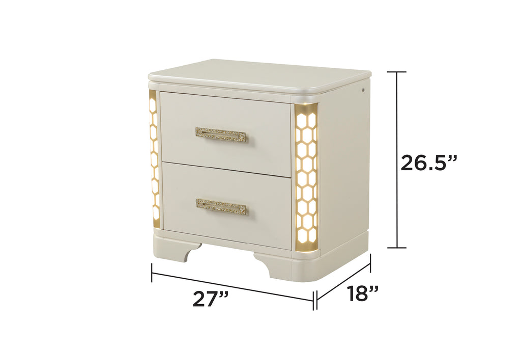 - The set includes a Queen bed with a champagne-toned, crystal button-tufted headboard, accompanied by LED-light accents for a contemporary flair.
