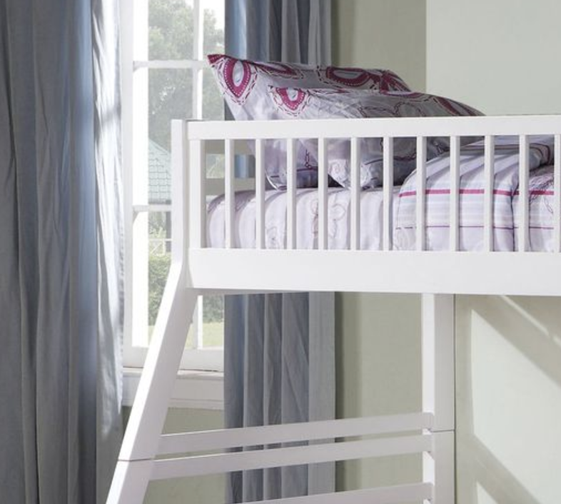- Safety Features: Equipped with a full-length slatted guardrail (16'H) for added safety on the upper bunk and a right-facing, built-in front ladder for easy access.