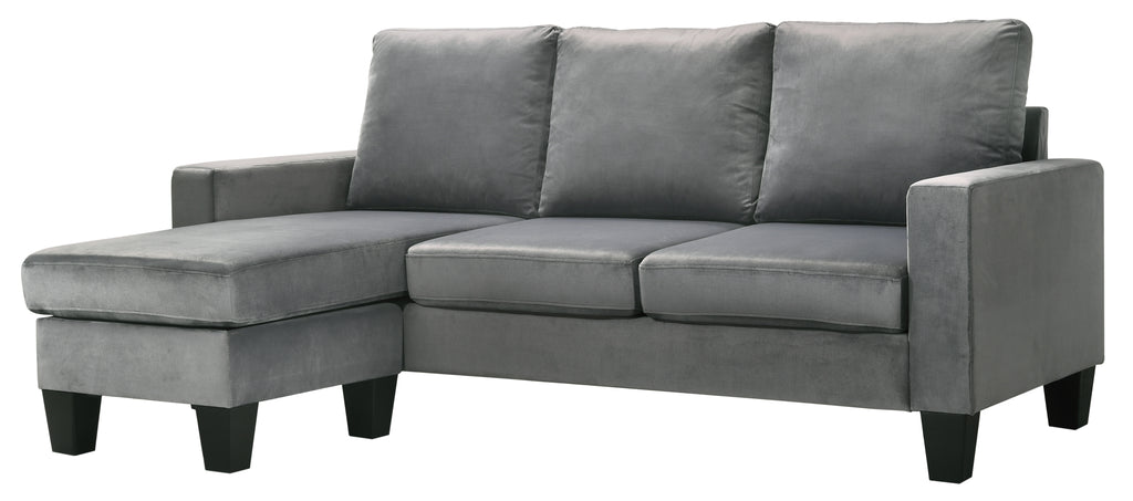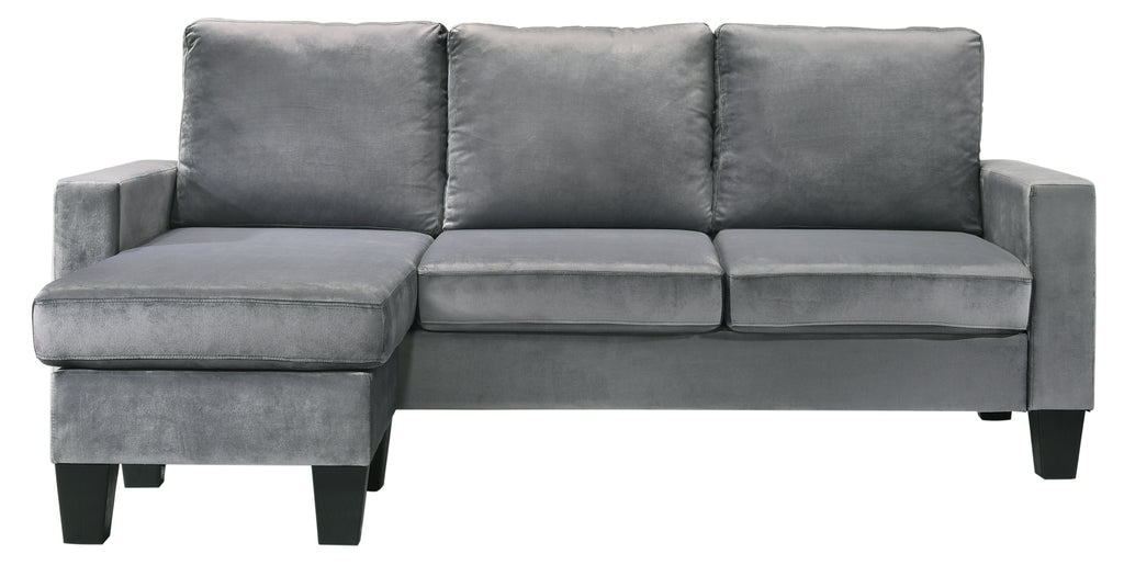 Transform your living space with this versatile, value-priced reversible sectional. Its chic design and practical features make it a delightful addition to any home. The inviting gray velvet cover not only enhances the design but also provides exceptional comfort for lounging and entertaining. Crafted with a durable hardwood and manufactured wood frame, this sectional is made to withstand everyday use.