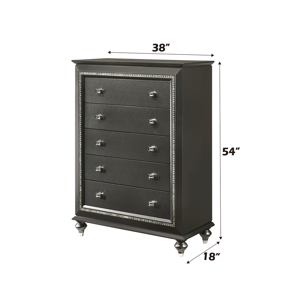 - With five drawers, the chest provides ample storage space, each mounted on side metal glides for smooth and quiet operation.