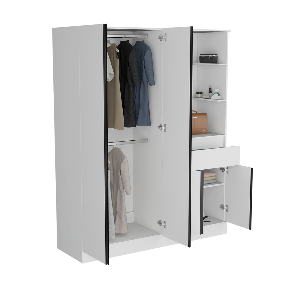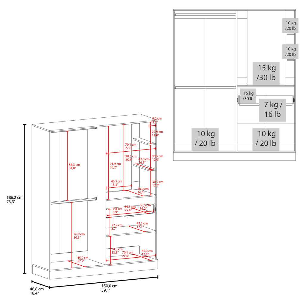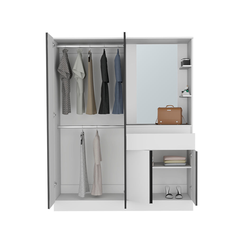 - Generous interior layout includes shelving and a hanging rod, offering versatile storage for clothes, accessories, and more.