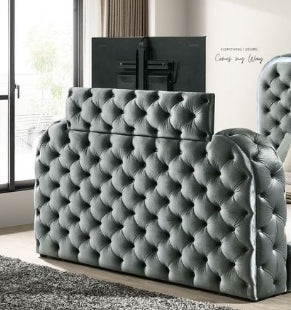 - Box Spring NOT Required, Full Upholstered Bed, HB with LED, FB with Fireplace Decor & TV Stand, Bottom Tufted, Remote Control Lift & Down (TV Stand)