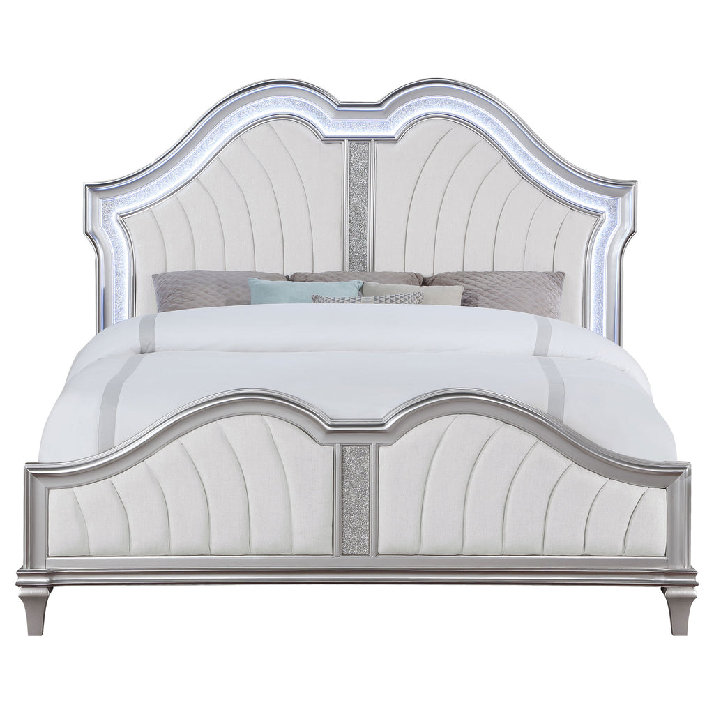 Blending modern design with luxurious details, this bed features a scalloped headboard and footboard wrapped in plush upholstery for a romantic, refined appeal. The soft ivory base, sleek silver accents, and integrated LED lighting create an elegant ambiance perfect for both classic and contemporary bedrooms.