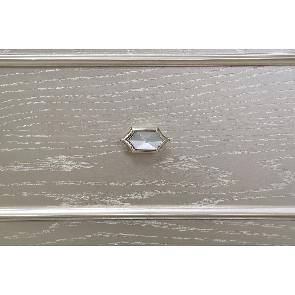 - Silver oak finish combined with glimmering accent panels provides an elegant, modern appearance that adds a glamorous finishing touch to the bedroom