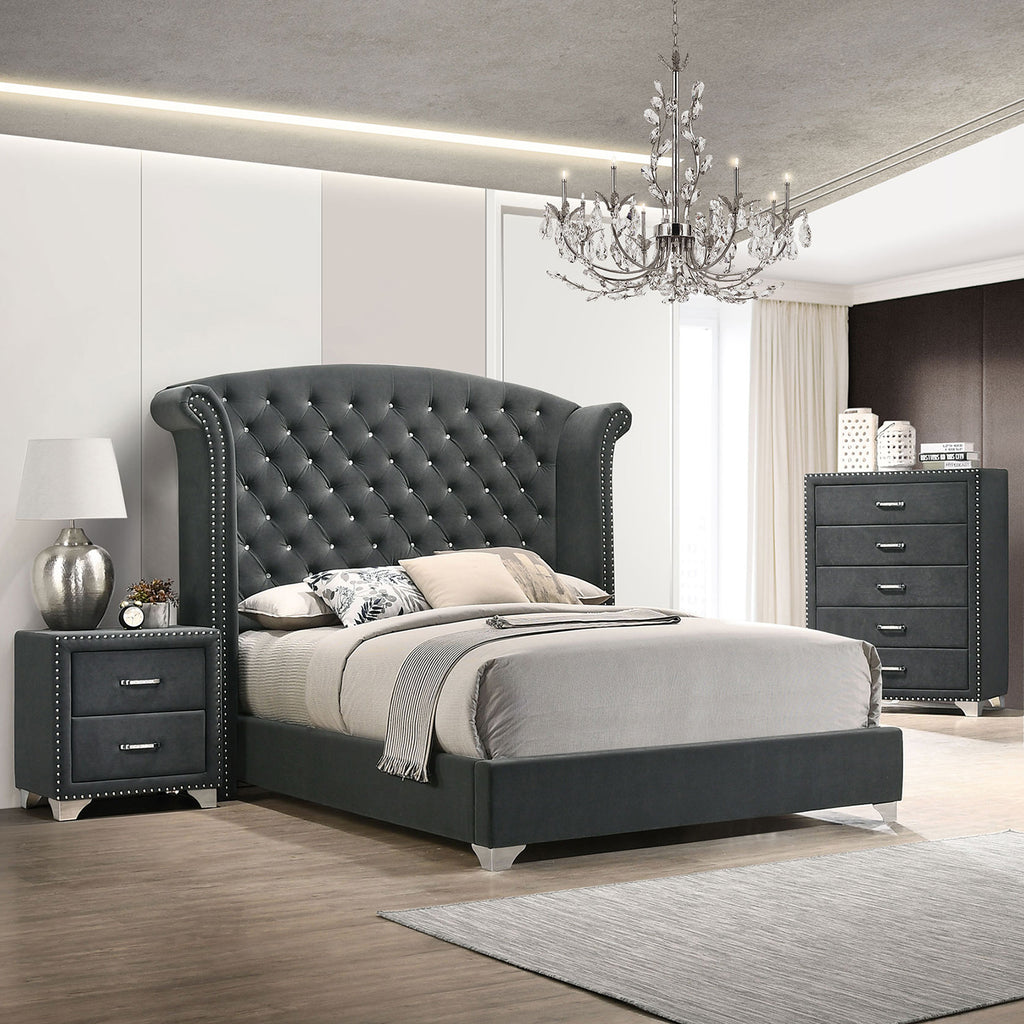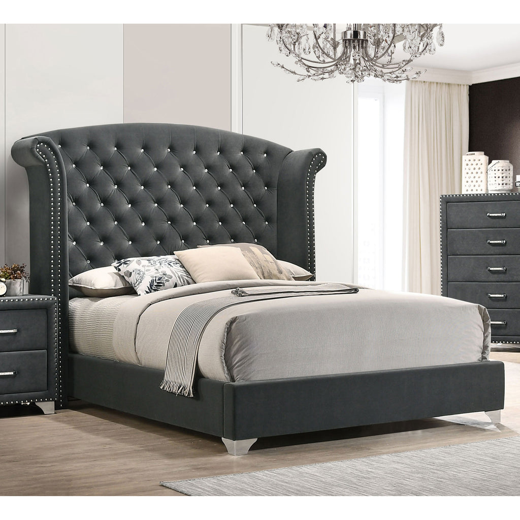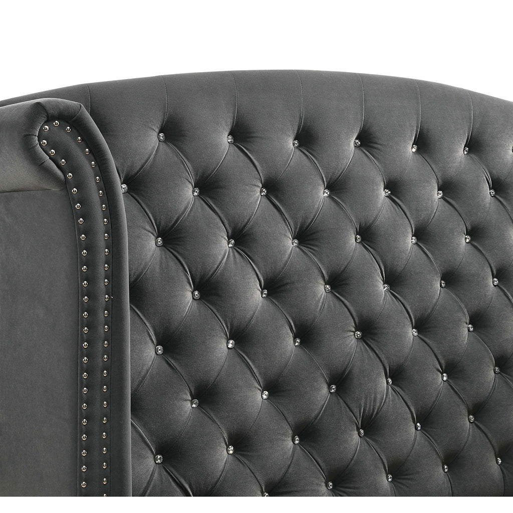 A gorgeous wingback headboard with imposing height and diamond tufting augmented with sparkling buttons anchors this modern glam upholstered bed. In soft gray, it's emphasized with gleaming chrome finish nailheads and a modern profile that includes upholstered rails for an open, airy look and feel.