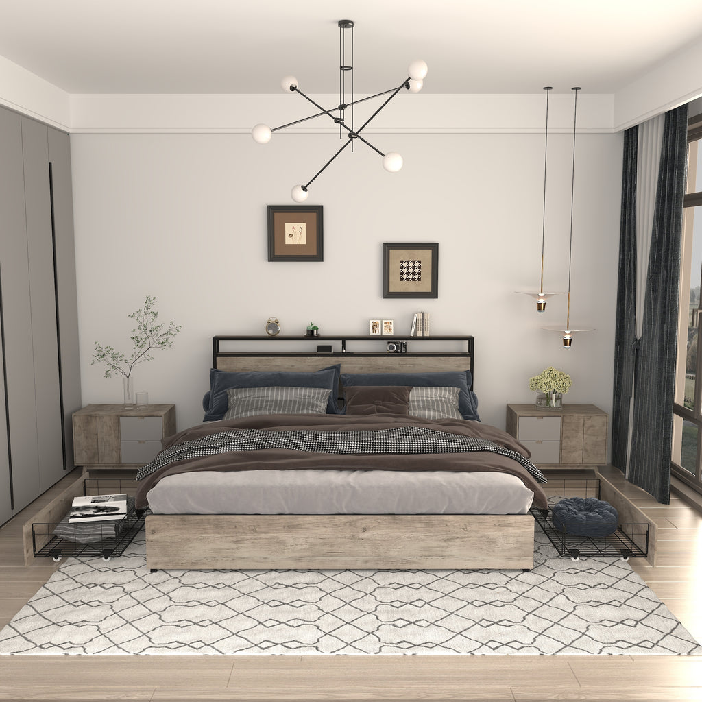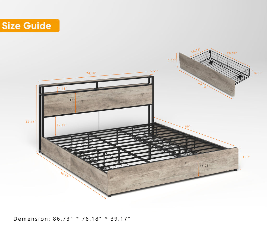 - Easy to Assemble The queen bed frame with storage drawers is well packaged and comes in one box. Complete instructions book and numbered parts, so you don't have to spend too much time to install it, it only takes 45 minutes to easily complete.