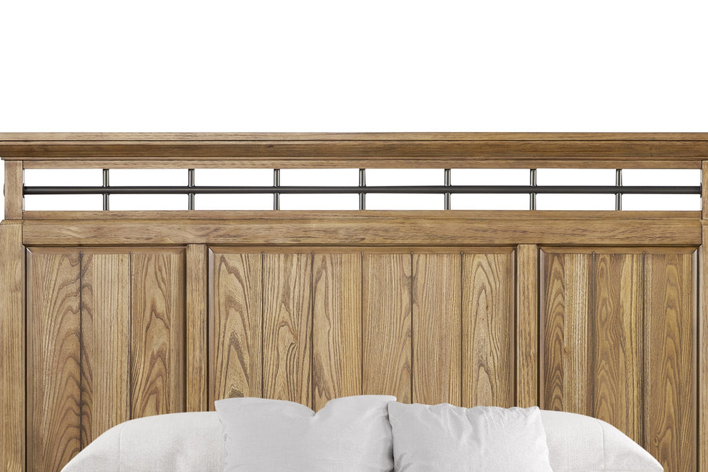 - The headboard features vertically aligned elm wood panels and a decorative top rail with metal accents for a refined architectural look