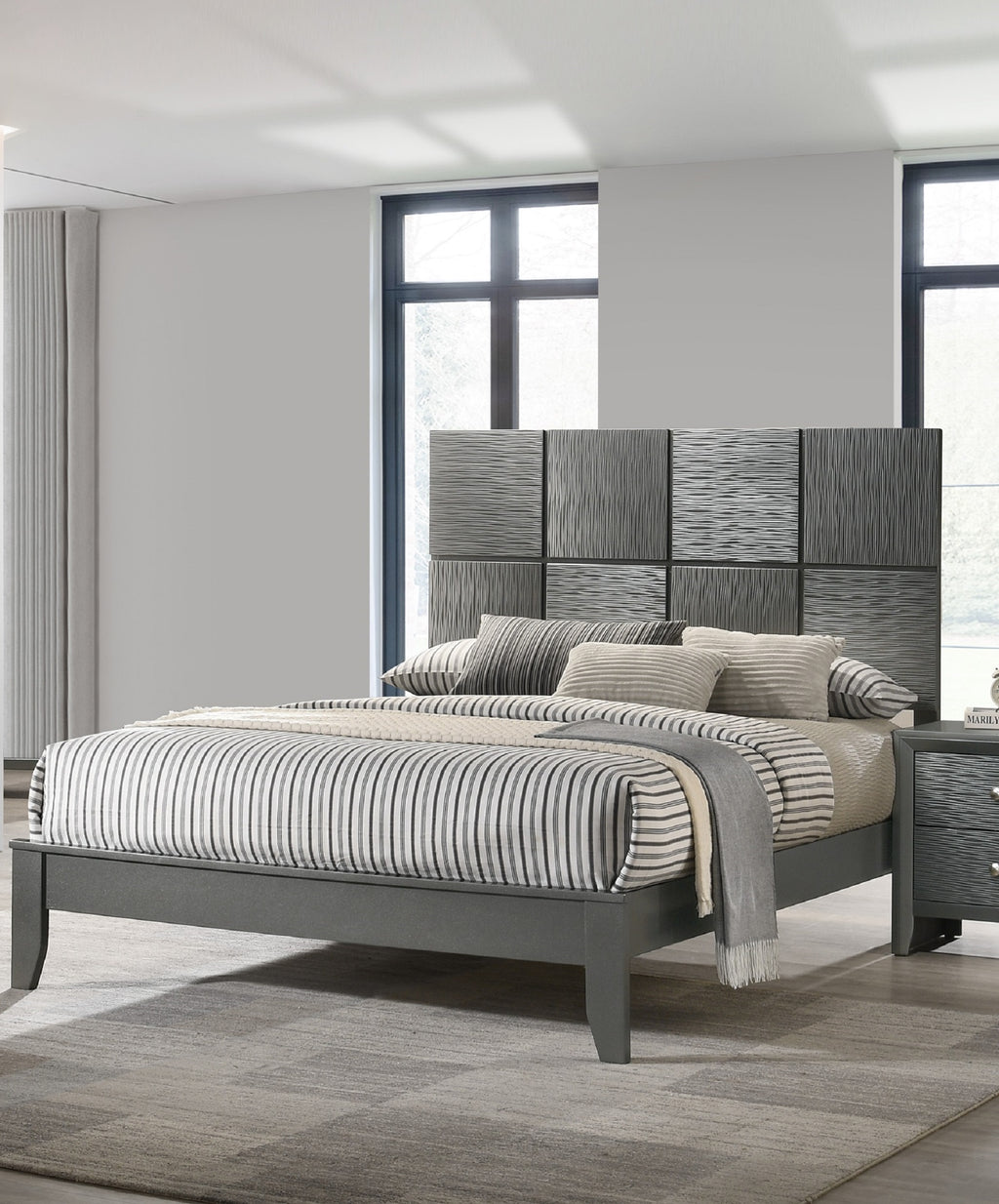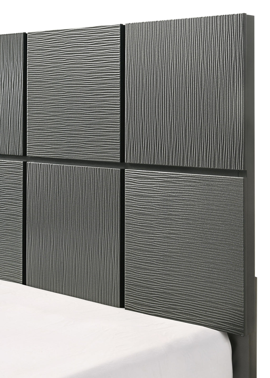 This bedroom collection is the embodiment of sleek, contemporary design, characterized by its rich gunmetal finish and distinctive textured front panels. The centerpiece, a chic bed with a statement headboard, features geometric paneling that adds depth and interest.