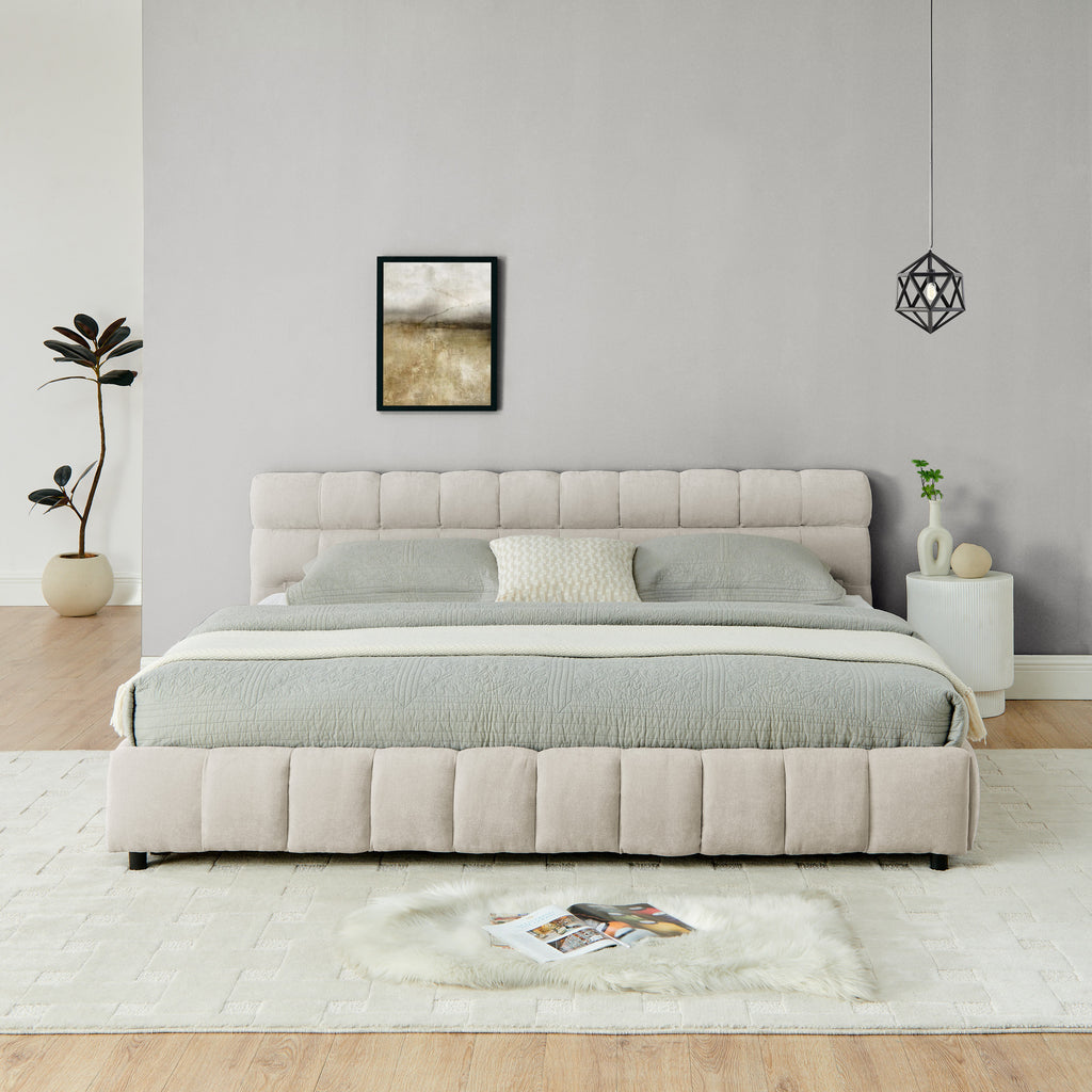- [Unique Grounded King Size Bed] - This grounded upholstered bed will be both a beautiful piece in the room and a place full of fun for your family. This beautiful modern King bed frame adds a contemporary chic look to your bedroom and is upholstered in thick chenille fabric to add extra comfort.