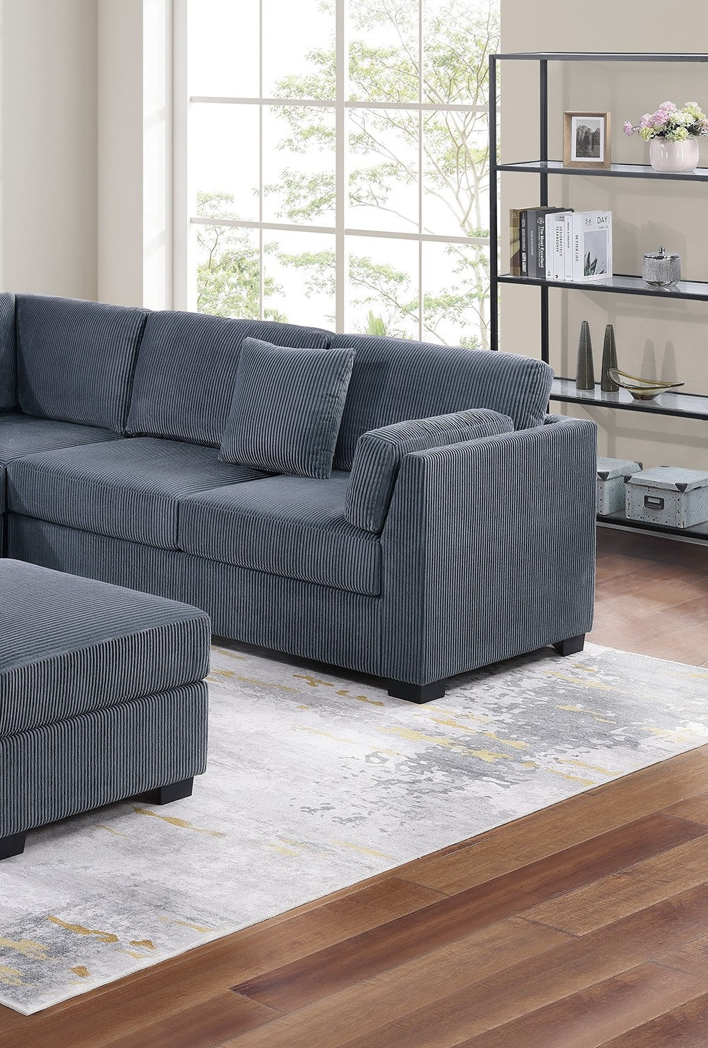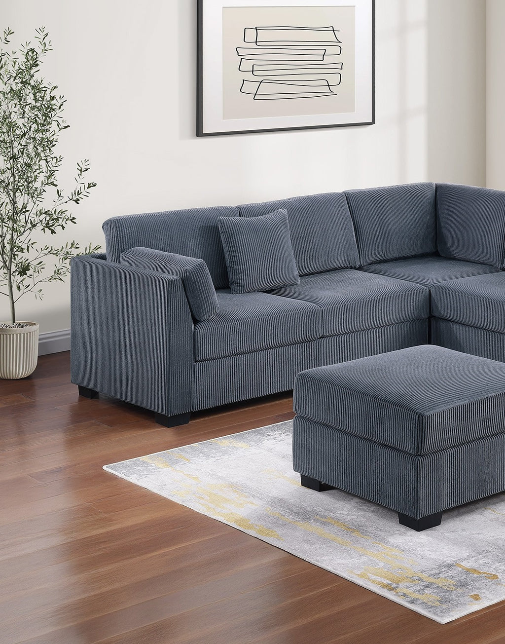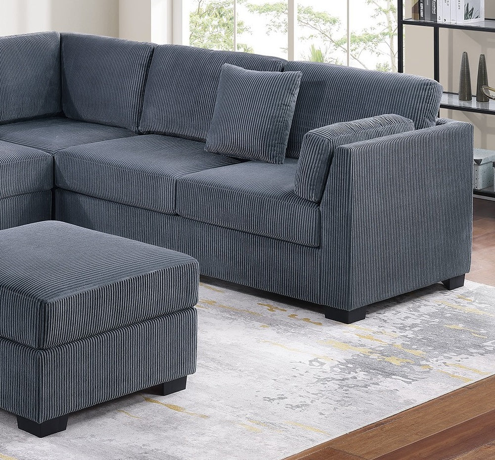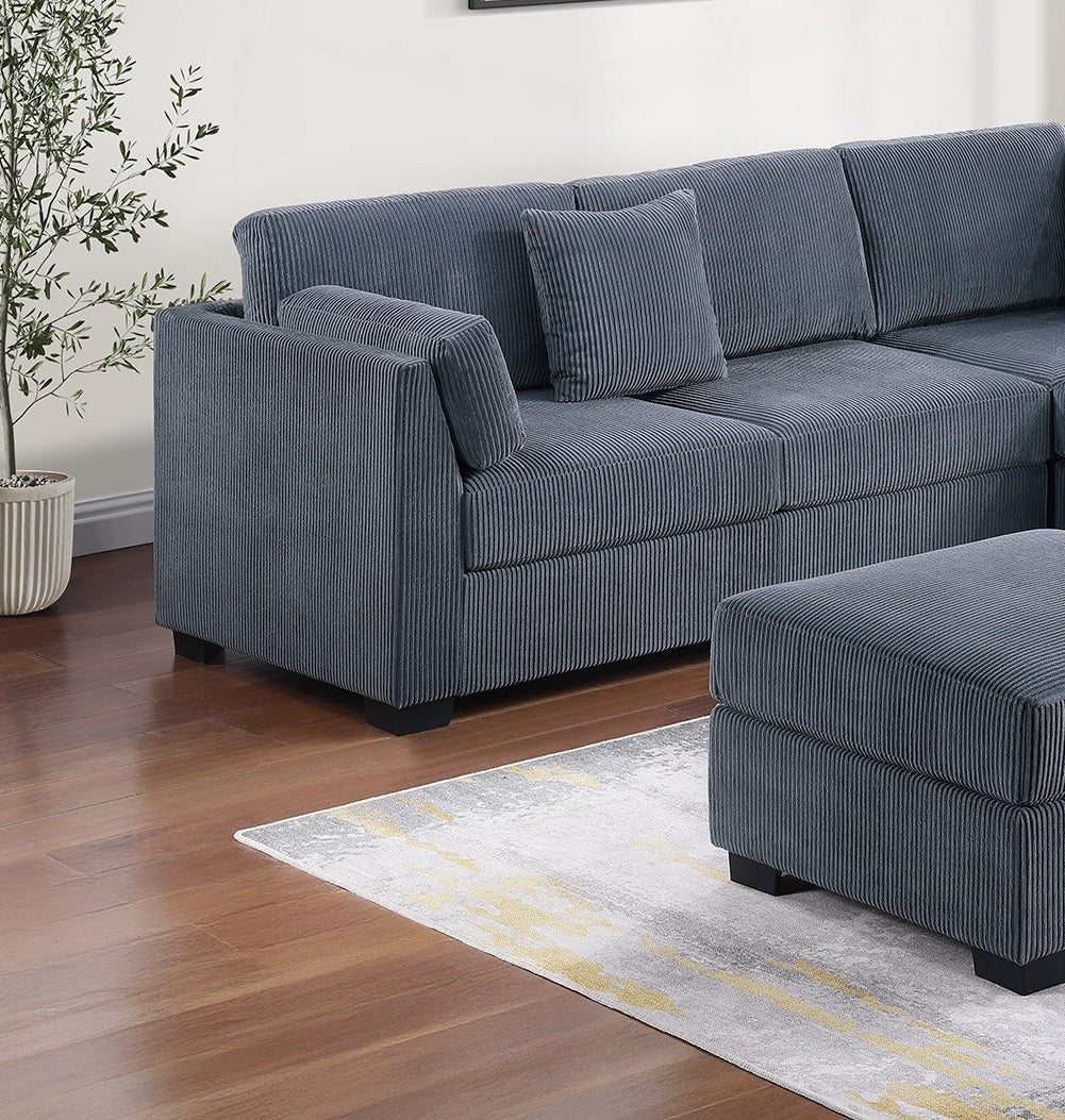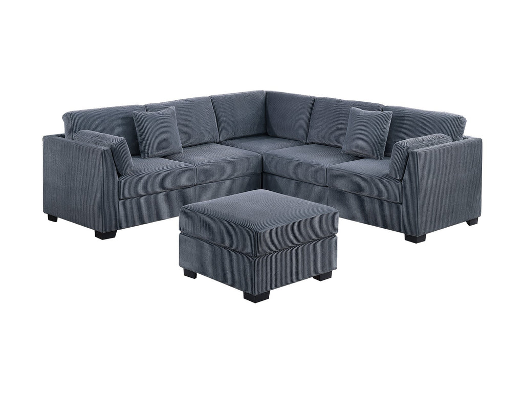 The 4-Piece L-Shaped Sectional Set with Ottoman brings a perfect combination of modern design and inviting comfort to any living space. Upholstered in luxuriously soft corduroy, this sectional offers a cozy yet sophisticated feel, making it the ideal centerpiece for relaxation and style. The L-shaped layout design optimizes both seating and room arrangement, perfect for lounging, entertaining, or unwinding after a long day. This sectional set includes a right-arm or left-arm one-arm loveseat, a corner wedge and a matching ottoman. The ottoman serves as a versatile addition, functioning as a footrest, an extra seat, or even a stylish coffee table alternative when paired with a tray. Designed with comfort in mind, this sectional features plush back cushions that provide soft, supportive seating for hours of relaxation. Two included throw pillows enhance the cozy appeal, while the two small side cushions offer additional arm support, ensuring a more comfortable lounging experience. The low-profile legs create a sleek and grounded look, adding to the sectional’s modern aesthetic. While the textured corduroy upholstery introduces warmth and a refined touch to any décor. Whether placed in a contemporary, minimalist, or cozy living room setting, this sectional adapts effortlessly, making it a versatile and stylish choice for any home.
