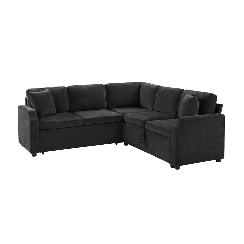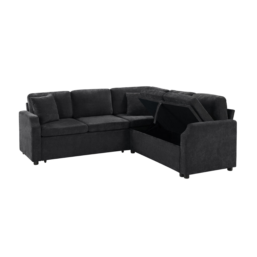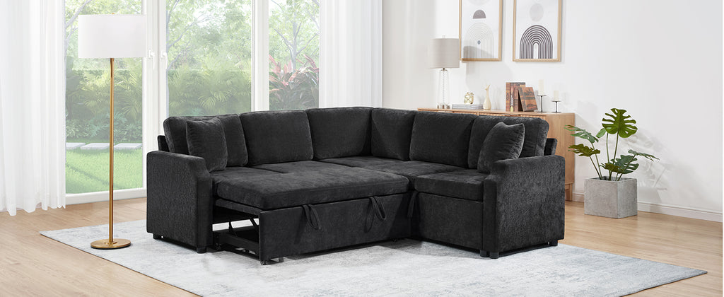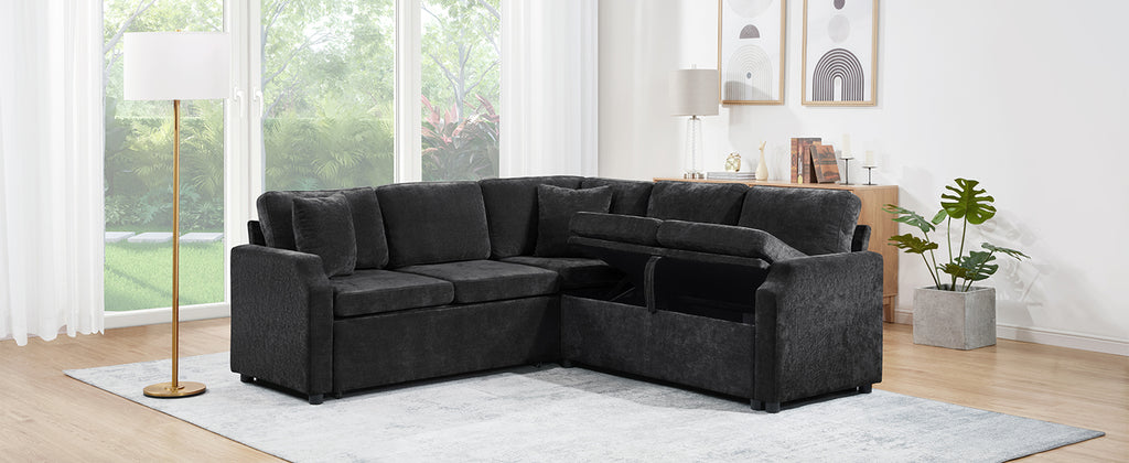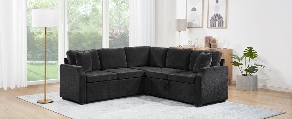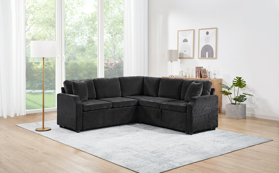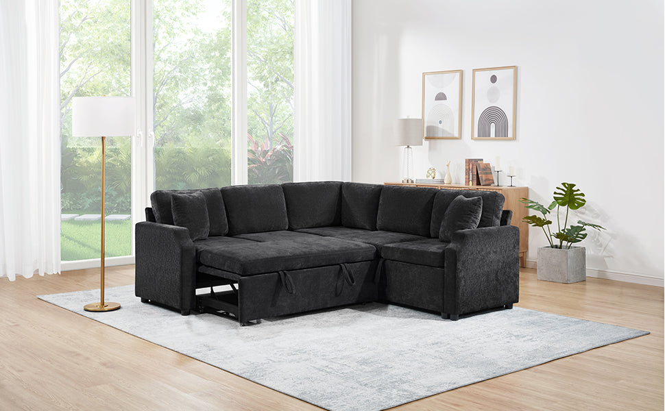 Bring both functionality and style to your living space with this multi-functional L-shaped sectional sofa. Designed for modern homes, it features a smooth pull-out sleeper that effortlessly converts into a bed—perfect for guests or relaxing weekends. One side offers a spacious hidden storage compartment to help keep your essentials neatly organized, while ultra-soft chenille fabric and matching throw pillows ensure everyday comfort. Finished with elegant curved armrests, this sofa combines smart space-saving features with a cozy, contemporary look, making it an ideal choice for apartments, guest rooms, or multifunctional living areas.