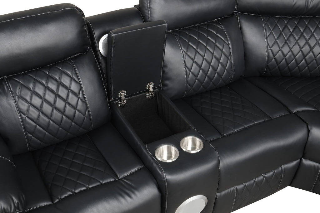 Experience luxury and advanced comfort with this power reclining sectional, perfect for elevating your home entertainment and relaxation experience. Crafted with plush cushioning and premium faux leather upholstery, this sectional offers a soft yet supportive feel, ensuring exceptional comfort during long hours of sitting or reclining. The dual power recliners allow you to find the perfect position at the touch of a button, while the integrated LED lighting adds a sleek, modern ambiance to your living space. Equipped with built-in Bluetooth speakers, this sectional lets you enjoy immersive sound, making movie nights or music sessions more engaging. The center console provides convenient storage and cup holders, keeping your essentials within arm’s reach, and USB and aux ports offer seamless connectivity for your devices.
