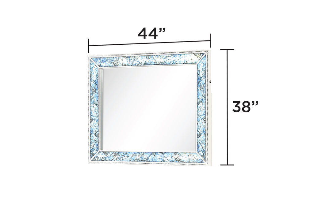 Redefine your sleeping space with this exquisite 5-piece bedroom set, combining luxurious design and premium functionality. The set features a statement-making bed with an upholstered headboard adorned with translucent blue marble accents and integrated LED lights, adding a stylish focal point. The dresser and nightstand offer spacious soft-closing drawers, finished with blue marble-centered handles and crystal accents, while the matching mirror with marble detailing and LED lighting enhances the room's atmosphere. The additional chest brings even more storage with five spacious drawers, completing the set with its sleek, cohesive design. This collection is ideal for those seeking a sophisticated and practical upgrade to their bedroom decor.