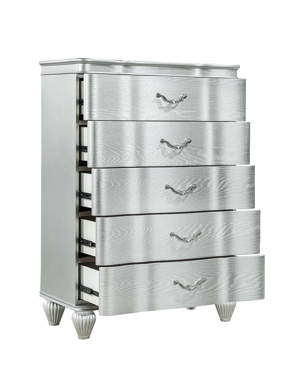 Add a touch of elegance and functionality to your bedroom with this stunning chest. Featuring a sleek, silver finish and a tall, narrow design, this chest is perfect for optimizing storage space in smaller rooms. The chest includes multiple spacious drawers with decorative handles, providing ample storage for clothing, accessories, and other essentials. The curved front design adds a sophisticated flair, while the sturdy construction ensures durability and long-lasting use. This chest seamlessly blends style and practicality, making it an ideal addition to any modern or traditional bedroom decor.