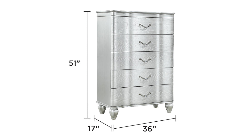 Add a touch of elegance and functionality to your bedroom with this stunning chest. Featuring a sleek, silver finish and a tall, narrow design, this chest is perfect for optimizing storage space in smaller rooms. The chest includes multiple spacious drawers with decorative handles, providing ample storage for clothing, accessories, and other essentials. The curved front design adds a sophisticated flair, while the sturdy construction ensures durability and long-lasting use. This chest seamlessly blends style and practicality, making it an ideal addition to any modern or traditional bedroom decor.
