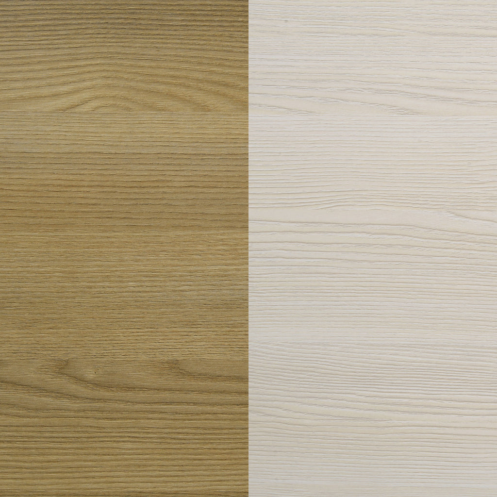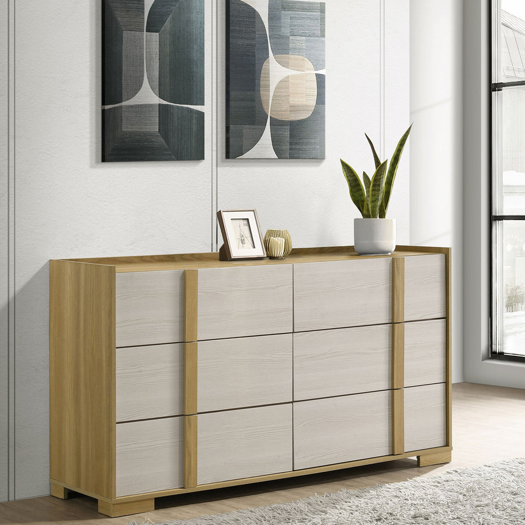 - Six-drawer dresser showcases a sophisticated blend of natural wood tones and white melamine panels influenced by modern Italian design