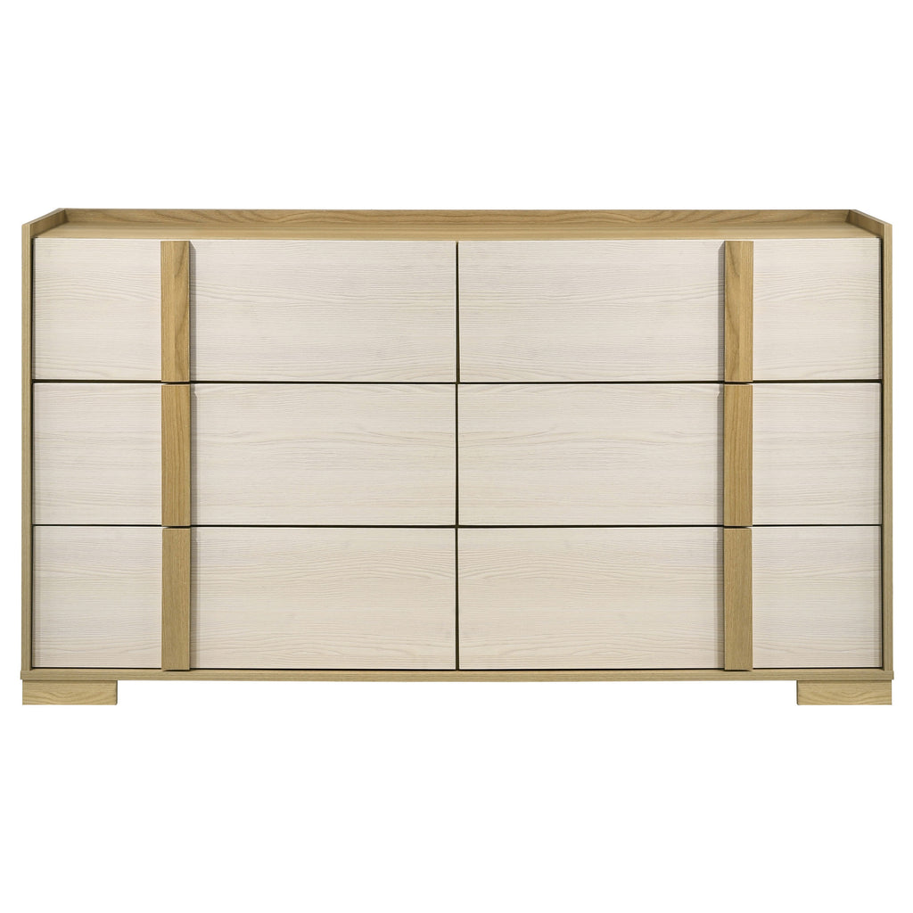 This six drawer dresser clears visual noise and adds warmth. The modern two tone look pairs sleek fronts with natural trim, and the sturdy surfaces and smooth glides make everyday routines feel effortless with folded tees and spare blankets at the ready.
