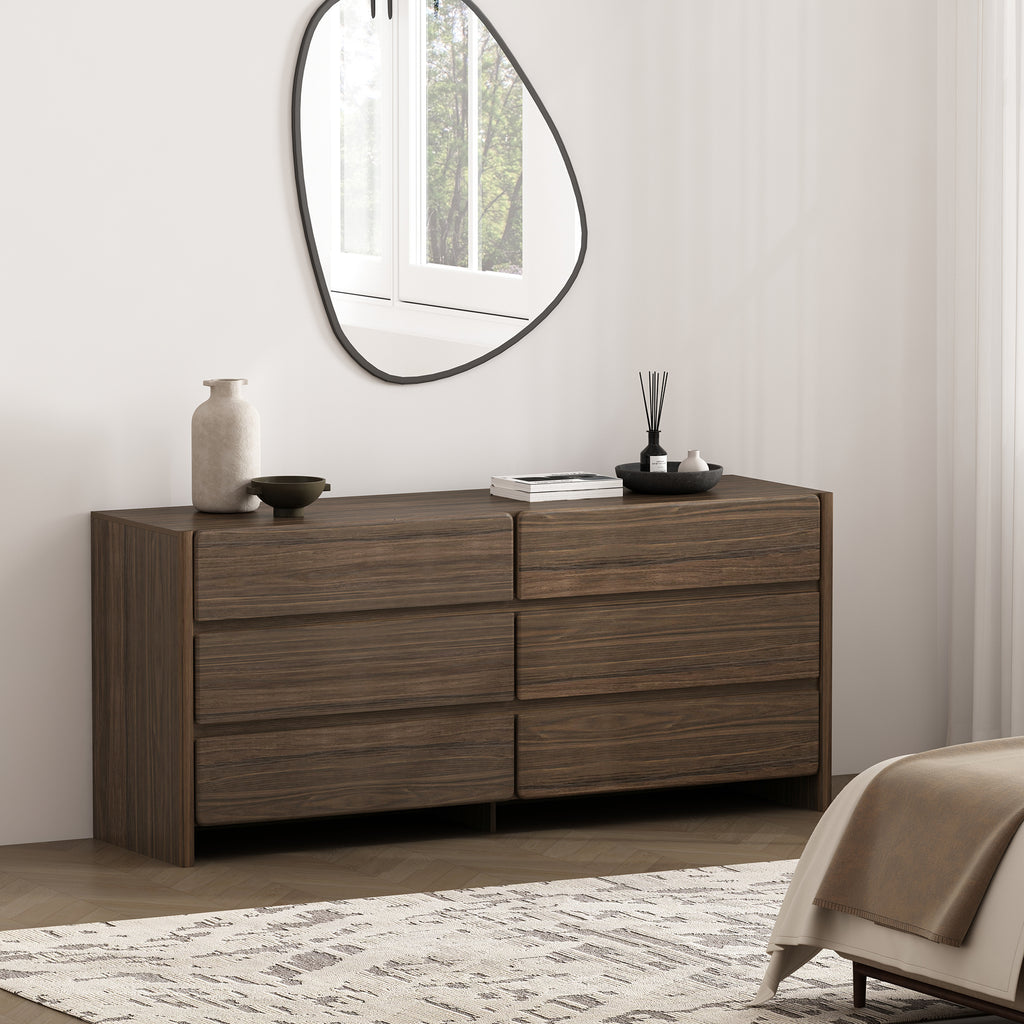 - Minimalist low-profile design with smooth, rounded drawer fronts for a soft modern aesthetic.