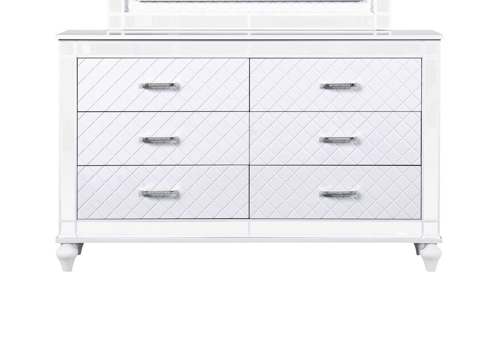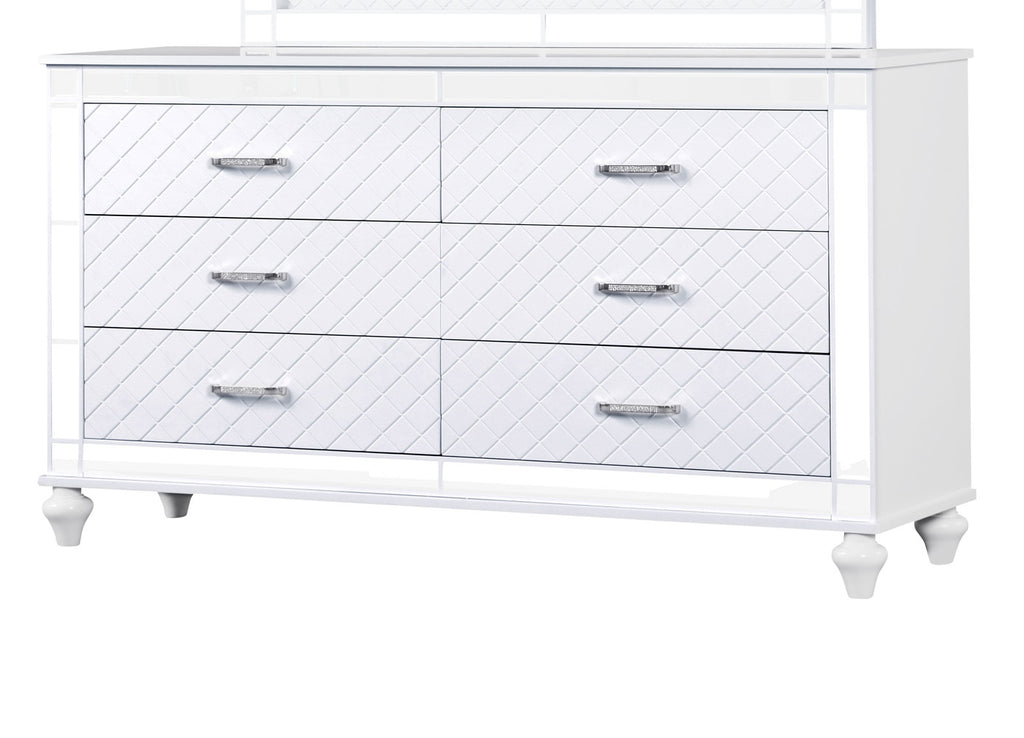 Transform your space with this sleek Silver Champagne dresser, designed to enhance any bedroom's aesthetic appeal. This stunning piece features a unique embossed wood finish adorned with a stylish X design that effortlessly adds character to your décor. The mirror trim accents on all case pieces and beds create a polished look that reflects light beautifully, making your room feel more spacious and inviting.