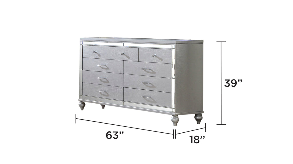 - English dovetail drawer construction with full extension metal ball bearing drawer glide. Frame material is blended solid and manufactured wood all all case goods are finished in Silver color with mirror accents.