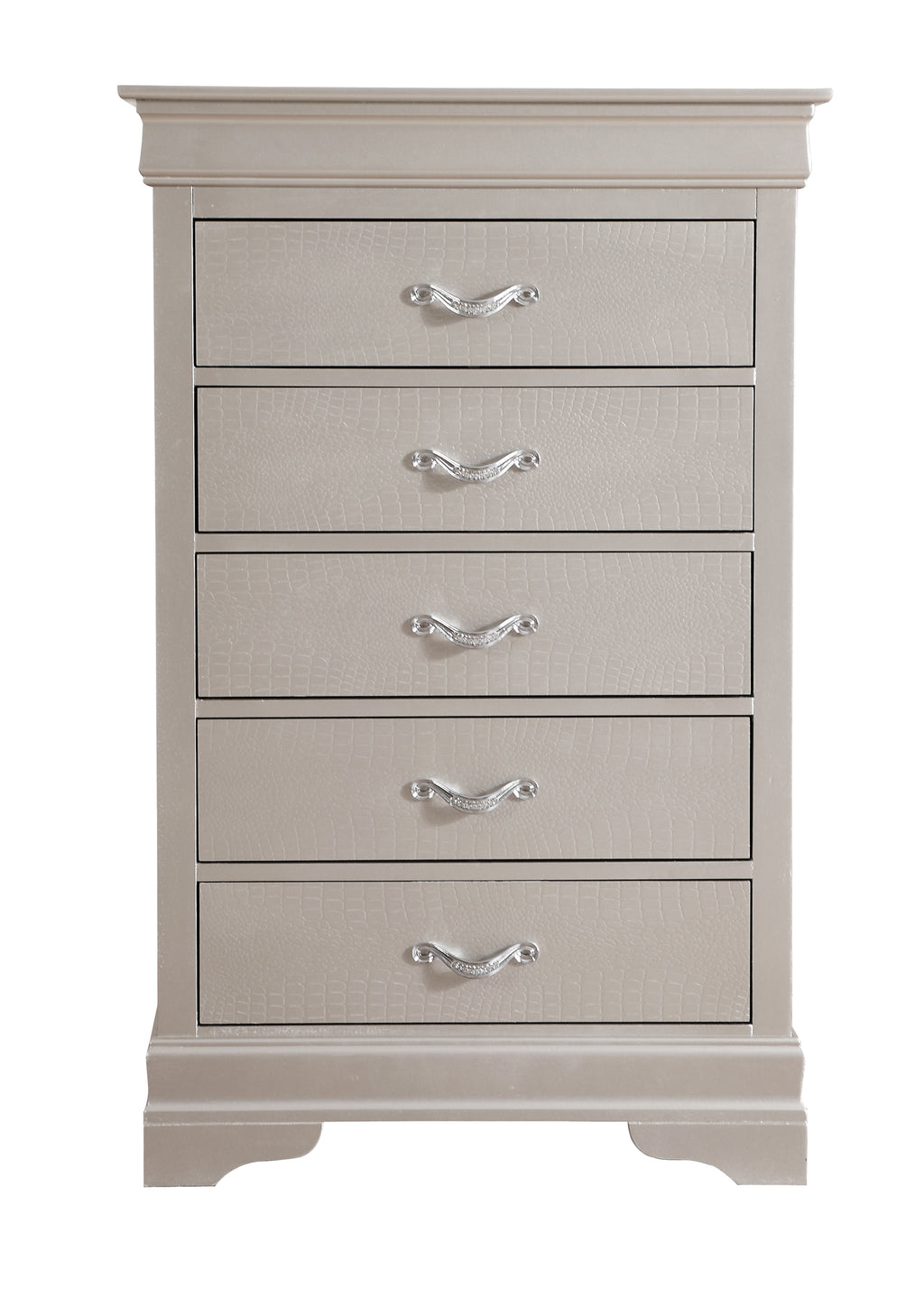 This stylish chest offers a modern aesthetic with its impressive silver champagne finish and distinctive croc texture, making it a captivating addition to any bedroom decor. It complements a range of design themes and serves as a striking focal point in your space. The expertly crafted features promise functionality without compromising on visual appeal.