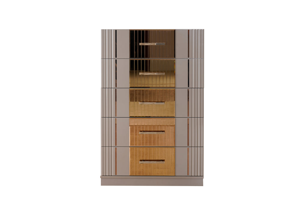 The 5-Drawer chest, as part of this luxurious bedroom set, stands out with its modern contemporary design. It features the same Metallic River sand-colored finish and bronze mirror accents as the rest of the set, ensuring a cohesive look. The chest offers ample storage space, with its design emphasizing slender shapes and straight lines. This piece is a blend of functionality and art, making it a perfect addition to the bedroom.