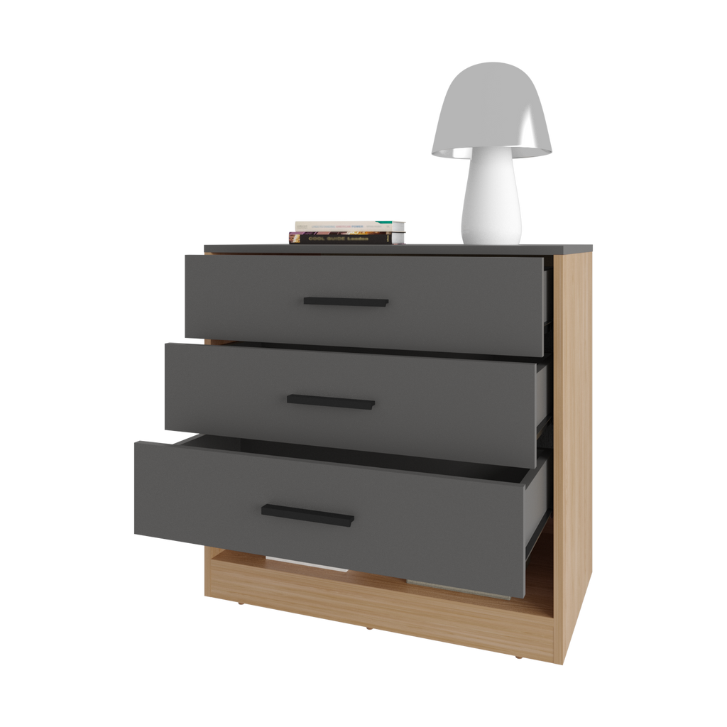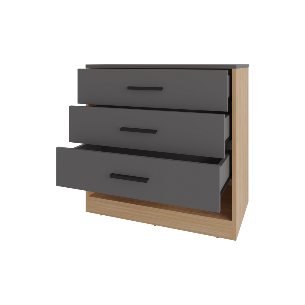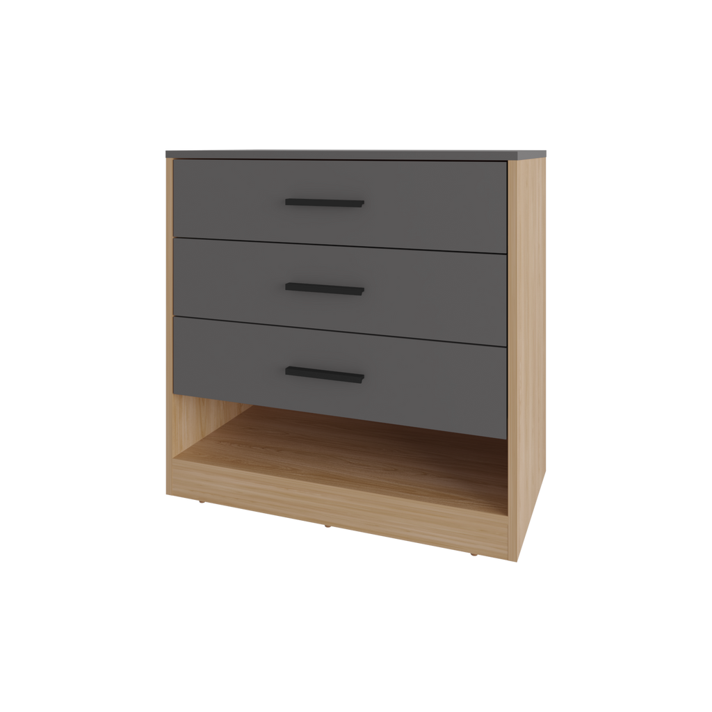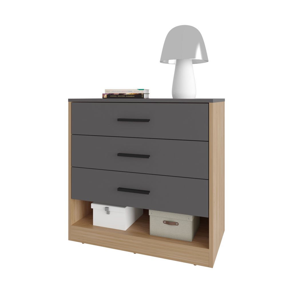 'Modern dresser with a sleek and functional design, perfect for adding style and storage to your bedroom. Featuring three spacious drawers, this dresser provides ample space to organize clothing, accessories, or personal items. The open bottom shelf offers additional storage for decorative items, books, or storage boxes.