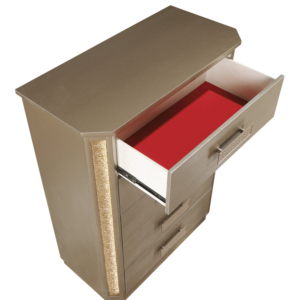 The 5 Drawer Chest is the epitome of style and organization. Its five spacious drawers provide a well organized storage solution, and the LED Light Accent enhances its charm. This chest features a dazzling gold and copper finish with a distinctive snake skin finish, making it a standout piece in your bedroom