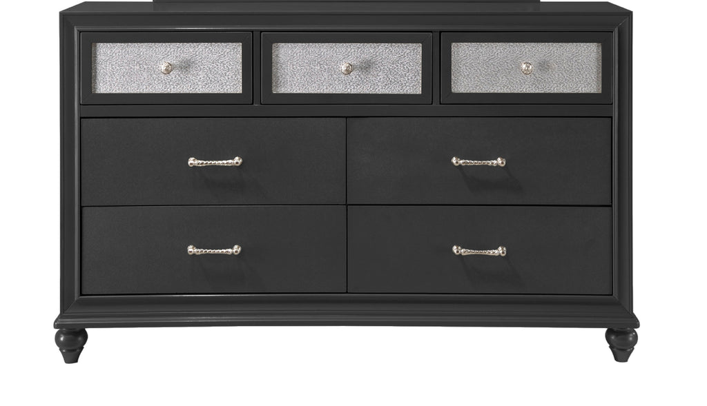 This Dresser will surely make a statement in your bedroom. It features seven drawers with bar handles and knobs, glitter accents on the top three drawer fronts, and comes in a black finish.