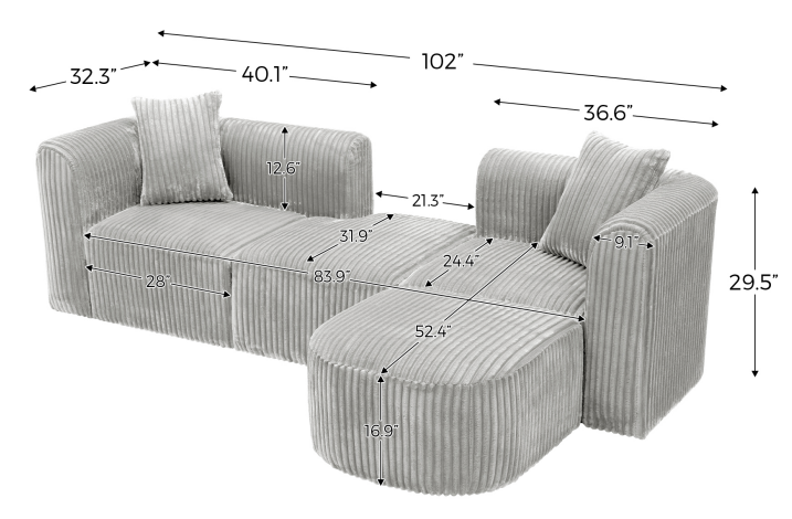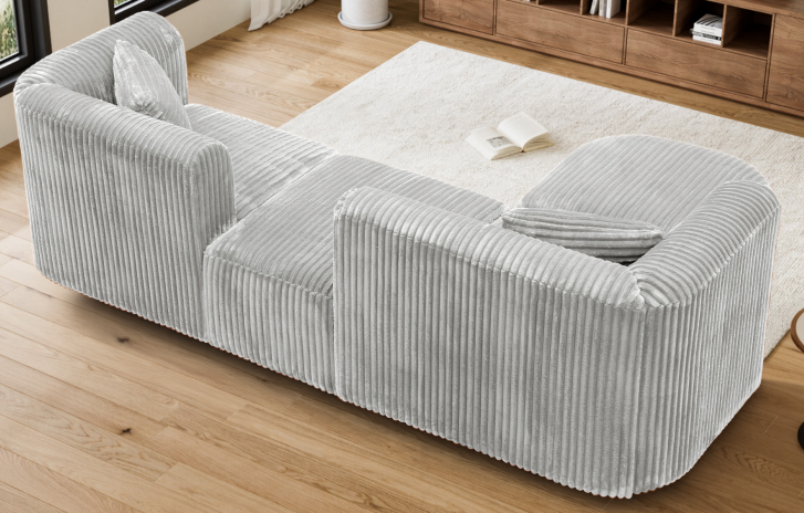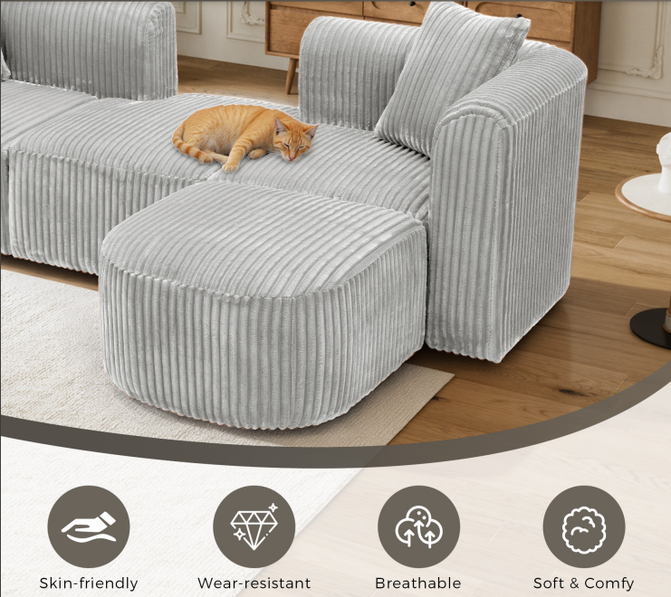 - Modern Curved Design - Our minimalist modular sectional sofa featuring smooth Corduroy fabric and sleek, curved lines that add an appealing touch to your living space. The L-shape 4 seater corner couch with movable ottoman design makes it suitable for relaxing with your family.