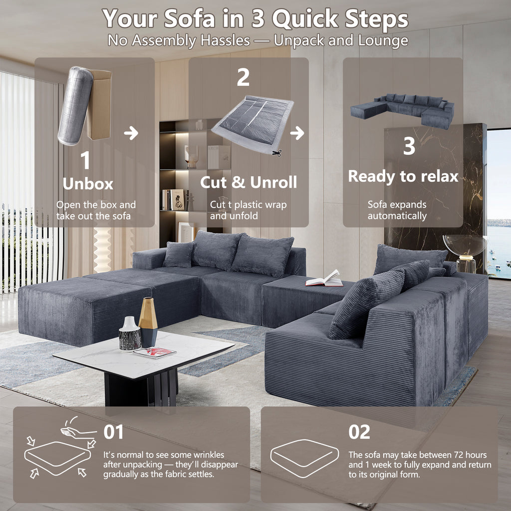 - Ready to Enjoy – No Assembly Required:Experience hassle-free luxury from the moment it arrives. Each module is fully assembled—simply unbox, gently fluff each piece, and let the cushions expand within 72 hours. No tools, no stress—just immediate comfort for the whole family.